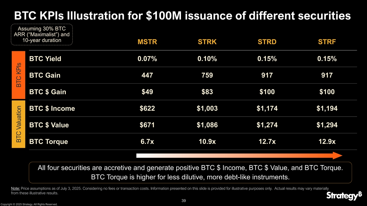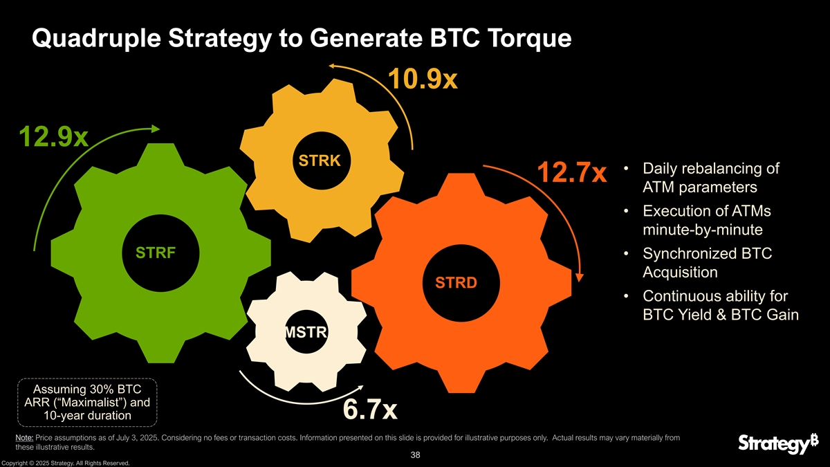 Quadruple Strategy to Generate BTC Torque 10.9x 12.9x STRK • Daily rebalancing of 12.7x ATM parameters • Execution of ATMs minute-by-minute STRF • Synchronized BTC Acquisition STRD • Continuous ability for BTC Yield & BTC Gain MSTR Assuming 30% BTC ARR (“Maximalist”) and 6.7x 10-year duration Note: Price assumptions as of July 3, 2025. Considering no fees or transaction costs. Information presented on this slide is provided for illustrative purposes only. Actual results may vary materially from these illustrative results. 38 38 Copyright © 2025 Strategy. All Rights Reserved.
