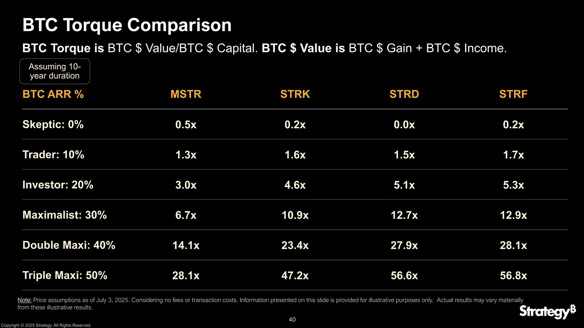 And we’re maximalist in general, and so if you have a 30% BTC ARR view, then you can look out a decade and you can calculate a BTC Torque of 6.7x for the equity, 10.9x for STRK, 12.7x for STRD, 12.9x for STRF. Now, each of those numbers, they’re a function of your outlook, right, your expectations of the of the next ten years. And so if you’re a skeptic, then you’re going to have a much lower view of what the what the BTC Torque is. So, the conclusion there is if you’re a skeptic, you probably don’t want to be holding, any equity instrument or any of these instruments, to tell you the truth. Right?
