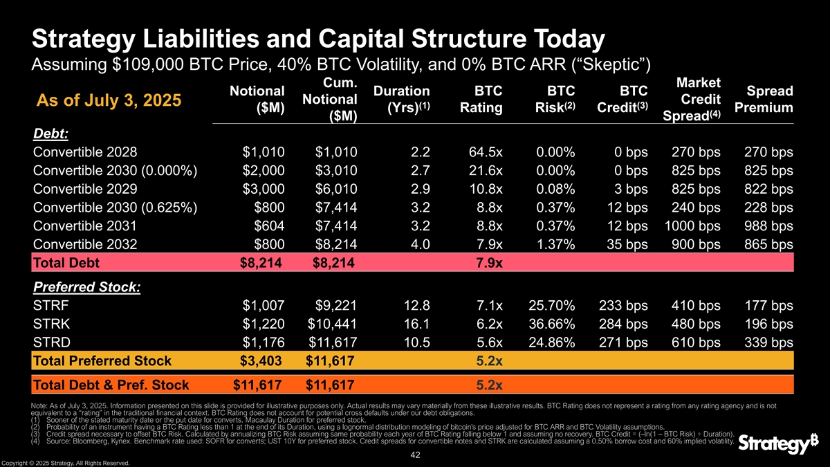 Strategy Liabilities and Capital Structure Today Assuming $109,000 BTC Price, 50% BTC Volatility, and 0% BTC ARR (“Skeptic”) Cum. Market Notional Duration BTC BTC BTC Spread Notional Credit As of July 3, 2025 (1) (2) (3) ($M) (Yrs) Rating Risk Credit Premium (4) ($M) Spread Debt: Convertible 2028 $1,010 $1,010 2.2 64.5x 0.00% 0 bps 270 bps 270 bps Convertible 2030 (0.000%) $2,000 $3,010 2.7 21.6x 0.04% 1 bps 825 bps 824 bps Convertible 2029 $3,000 $6,010 2.9 10.8x 0.90% 31 bps 825 bps 794 bps Convertible 2030 (0.625%) $800 $7,414 3.2 8.8x 2.37% 75 bps 240 bps 165 bps Convertible 2031 $604 $7,414 3.2 8.8x 2.37% 75 bps 1000 bps 925 bps Convertible 2032 $800 $8,214 4.0 7.9x 5.63% 147 bps 900 bps 753 bps Total Debt $8,214 $8,214 7.9x Preferred Stock: STRF $1,007 $9,221 12.8 7.1x 42.05% 427 bps 410 bps -17 bps STRK $1,220 $10,441 16.1 6.2x 53.50% 477 bps 480 bps 3 bps STRD $1,176 $11,617 10.5 5.6x 40.09% 487 bps 610 bps 123 bps Total Preferred Stock $3,403 $11,617 5.2x Total Debt & Pref. Stock $11,617 $11,617 5.2x Note: As of July 3, 2025. Information presented on this slide is provided for illustrative purposes only. Actual results may vary materially from these illustrative results. BTC Rating does not represent a rating from any rating agency and is not equivalent to a “rating” in the traditional financial context. BTC Rating does not account for potential cross defaults under our debt obligations. (1) Sooner of the stated maturity date or the put date for converts. Macaulay Duration for preferred stock. (2) Probability of an instrument having a BTC Rating less than 1 at the end of its Duration, using a lognormal distribution modeling of bitcoin’s price adjusted for BTC ARR and BTC Volatility assumptions. (3) Credit spread necessary to offset BTC Risk. Calculated by annualizing BTC Risk assuming same probability each year of BTC Rating falling below 1 and assuming no recovery. BTC Credit = (–ln(1 – BTC Risk) ÷ Duration). (4) Source: Bloomberg, Kynex. Benchmark rate used: SOFR for converts; UST 10Y for preferred stock. Credit spreads for convertible notes and STRK are calculated assuming a 0.50% borrow cost and 60% implied volatility. 41 Copyright © 2025 Strategy. All Rights Reserved.
