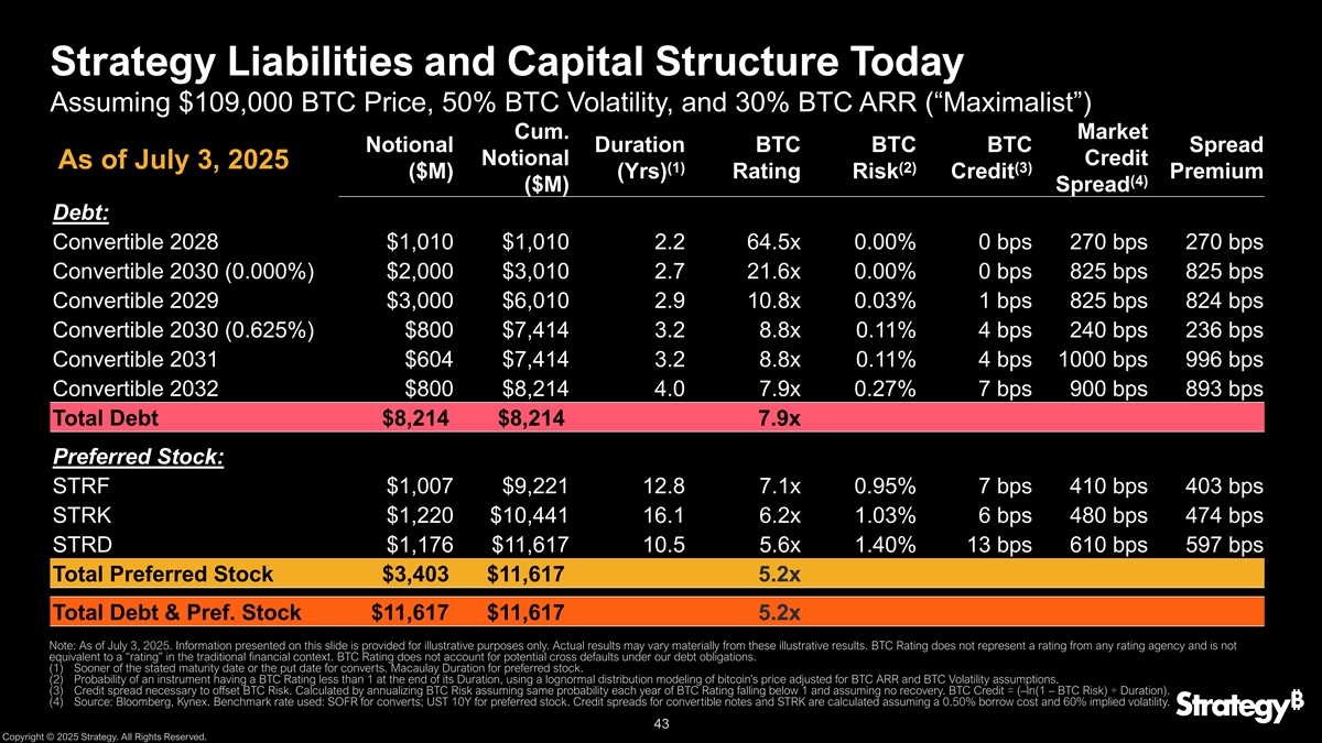 Strategy Liabilities and Capital Structure Today Assuming $109,000 BTC Price, 40% BTC Volatility, and 0% BTC ARR (“Skeptic”) Cum. Market Notional Duration BTC BTC BTC Spread Notional Credit As of July 3, 2025 (1) (2) (3) ($M) (Yrs) Rating Risk Credit Premium (4) ($M) Spread Debt: Convertible 2028 $1,010 $1,010 2.2 64.5x 0.00% 0 bps 270 bps 270 bps Convertible 2030 (0.000%) $2,000 $3,010 2.7 21.6x 0.00% 0 bps 825 bps 825 bps Convertible 2029 $3,000 $6,010 2.9 10.8x 0.08% 3 bps 825 bps 822 bps Convertible 2030 (0.625%) $800 $7,414 3.2 8.8x 0.37% 12 bps 240 bps 228 bps Convertible 2031 $604 $7,414 3.2 8.8x 0.37% 12 bps 1000 bps 988 bps Convertible 2032 $800 $8,214 4.0 7.9x 1.37% 35 bps 900 bps 865 bps Total Debt $8,214 $8,214 7.9x Preferred Stock: STRF $1,007 $9,221 12.8 7.1x 25.70% 233 bps 410 bps 177 bps STRK $1,220 $10,441 16.1 6.2x 36.66% 284 bps 480 bps 196 bps STRD $1,176 $11,617 10.5 5.6x 24.86% 271 bps 610 bps 339 bps Total Preferred Stock $3,403 $11,617 5.2x Total Debt & Pref. Stock $11,617 $11,617 5.2x Note: As of July 3, 2025. Information presented on this slide is provided for illustrative purposes only. Actual results may vary materially from these illustrative results. BTC Rating does not represent a rating from any rating agency and is not equivalent to a “rating” in the traditional financial context. BTC Rating does not account for potential cross defaults under our debt obligations. (1) Sooner of the stated maturity date or the put date for converts. Macaulay Duration for preferred stock. (2) Probability of an instrument having a BTC Rating less than 1 at the end of its Duration, using a lognormal distribution modeling of bitcoin’s price adjusted for BTC ARR and BTC Volatility assumptions. (3) Credit spread necessary to offset BTC Risk. Calculated by annualizing BTC Risk assuming same probability each year of BTC Rating falling below 1 and assuming no recovery. BTC Credit = (–ln(1 – BTC Risk) ÷ Duration). (4) Source: Bloomberg, Kynex. Benchmark rate used: SOFR for converts; UST 10Y for preferred stock. Credit spreads for convertible notes and STRK are calculated assuming a 0.50% borrow cost and 60% implied volatility. 42 Copyright © 2025 Strategy. All Rights Reserved.