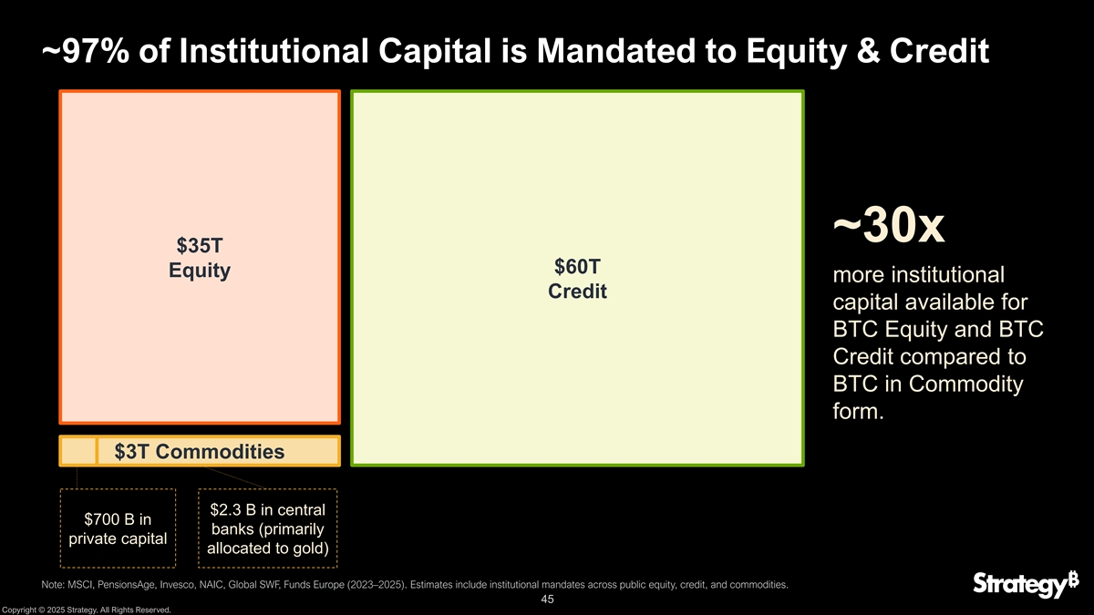 ~97% of Institutional Capital is Mandated to Equity & Credit ~30x $35T $60T Equity more institutional Credit capital available for BTC Equity and BTC Credit compared to BTC in Commodity form. $3T Commodities $2.3 B in central $700 B in banks (primarily private capital allocated to gold) Note: MSCI, PensionsAge, Invesco, NAIC, Global SWF, Funds Europe (2023–2025). Estimates include institutional mandates across public equity, credit, and commodities. 45 Copyright © 2025 Strategy. All Rights Reserved.