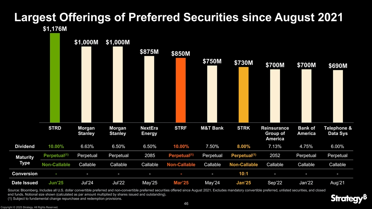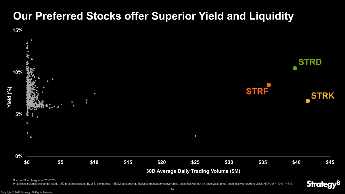 Largest Offerings of Preferred Securities since August 2021 $1,176M $1,000M $1,000M $875M $850M $750M $730M $700M $700M $690M STRD Morgan Morgan NextEra STRF M&T Bank STRK Reinsurance Bank of Telephone & Stanley Stanley Energy Group of America Data Sys America Dividend 10.00% 6.63% 6.50% 6.50% 10.00% 7.50% 8.00% 7.13% 4.75% 6.00% (1) (1) (1) Perpetual Perpetual Perpetual 2085 Perpetual Perpetual Perpetual 2052 Perpetual Perpetual Maturity Type Non-Callable Callable Callable Callable Non-Callable Callable Non-Callable Callable Callable Callable Conversion - - - - - - 10:1 - - - Date Issued Jun’25 Jul’24 Jul’22 May’25 Mar’25 May’24 Jan’25 Sep’22 Jan’22 Aug’21 Source: Bloomberg. Includes all U.S. dollar convertible preferred and non-convertible preferred securities offered since August 2021. Excludes mandatory convertible preferred, unlisted securities, and closed end funds. Notional size shown (calculated as par amount multiplied by shares issued and outstanding). (1) Subject to fundamental change repurchase and redemption provisions. 46 Copyright © 2025 Strategy. All Rights Reserved.