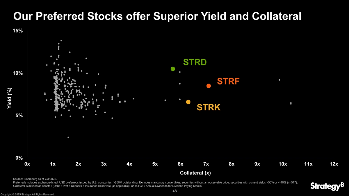 Our Preferred Stocks offer Superior Yield and Liquidity 15% STRD 10% STRF STRK 5% 0% $0 $5 $10 $15 $20 $25 $30 $35 $40 $45 30D Average Daily Trading Volume ($M) Source: Bloomberg as of 7/3/2025. Preferreds includes exchange-listed, USD preferreds issued by U.S. companies, >$50M outstanding. Excludes mandatory convertibles, securities without an observable price, securities with current yields >50% or <-10% (n=517). 47 Copyright © 2025 Strategy. All Rights Reserved. Yield (%)