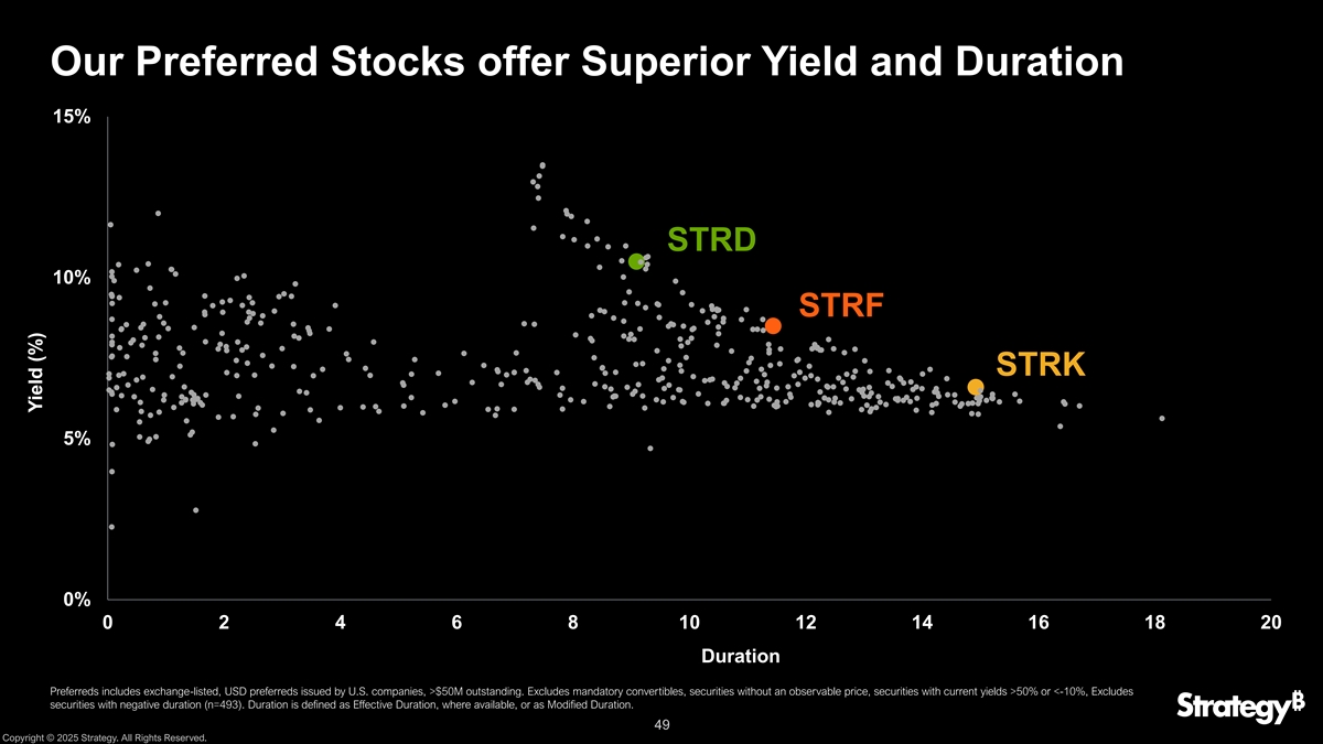 Our Preferred Stocks offer Superior Yield and Collateral 15% STRD 10% STRF STRK 5% 0% 0x 1x 2x 3x 4x 5x 6x 7x 8x 9x 10x 11x 12x Collateral (x) Source: Bloomberg as of 7/3/2025. Preferreds includes exchange-listed, USD preferreds issued by U.S. companies, >$50M outstanding. Excludes mandatory convertibles, securities without an observable price, securities with current yields >50% or <-10% (n=517). Collateral is defined as Assets / (Debt + Pref + Deposits + Insurance Reserves) (as applicable), or as FCF / Annual Dividends for Dividend Paying Stocks. 48 Copyright © 2025 Strategy. All Rights Reserved. Yield (%)