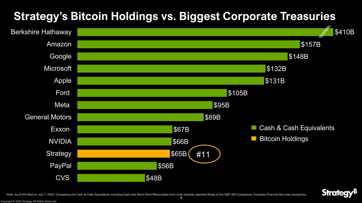 Here you’ll see our total Bitcoin holdings, as of the end of Q2, June 30th, 2025, our Bitcoin holdings at this point in time are at $65 billion, which put us as the 11th largest corporate treasury in the United States, excluding financial services companies. So slightly below Nvidia, a billion dollars less, and quite a bit above, number twelve, which is PayPal.