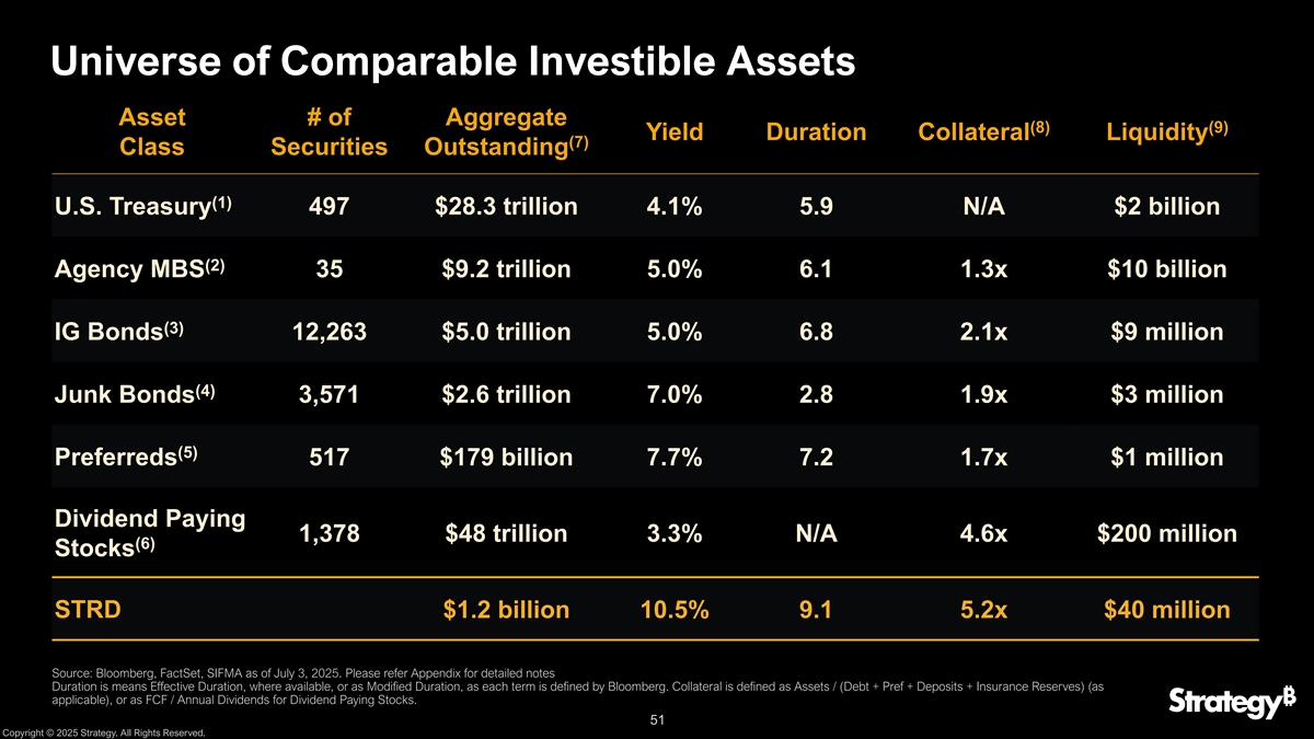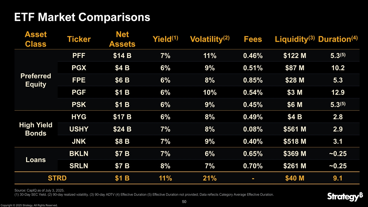 ETF Market Comparisons Asset Net (1) (2) (3) (4) Ticker Yield Volatility Fees Liquidity Duration Class Assets (5) PFF $14 B 7% 11% 0.46% $122 M 5.3 PGX $4 B 6% 9% 0.51% $87 M 10.2 Preferred FPE $6 B 6% 8% 0.85% $28 M 5.3 Equity PGF $1 B 6% 10% 0.54% $3 M 12.9 (5) PSK $1 B 6% 9% 0.45% $6 M 5.3 HYG $17 B 6% 8% 0.49% $4 B 2.8 High Yield USHY $24 B 7% 8% 0.08% $561 M 2.9 Bonds JNK $8 B 7% 9% 0.40% $518 M 3.1 BKLN $7 B 7% 6% 0.65% $369 M ~0.25 Loans SRLN $7 B 8% 7% 0.70% $261 M ~0.25 STRD $1 B 11% 21% - $40 M 9.1 Source: CapIQ as of July 3, 2025. (1) 30-Day SEC Yield. (2) 90-day realized volatility. (3) 90-day ADTV (4) Effective Duration (5) Effective Duration not provided; Data reflects Category Average Effective Duration. 50 Copyright © 2025 Strategy. All Rights Reserved.