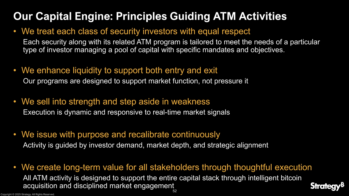 Our Capital Engine: Principles Guiding ATM Activities • We treat each class of security investors with equal respect Each security along with its related ATM program is tailored to meet the needs of a particular type of investor managing a pool of capital with specific mandates and objectives. • We enhance liquidity to support both entry and exit Our programs are designed to support market function, not pressure it • We sell into strength and step aside in weakness Execution is dynamic and responsive to real-time market signals • We issue with purpose and recalibrate continuously Activity is guided by investor demand, market depth, and strategic alignment • We create long-term value for all stakeholders through thoughtful execution All ATM activity is designed to support the entire capital stack through intelligent bitcoin acquisition and disciplined market engagement 52 52 Copyright © 2025 Strategy. All Rights Reserved.