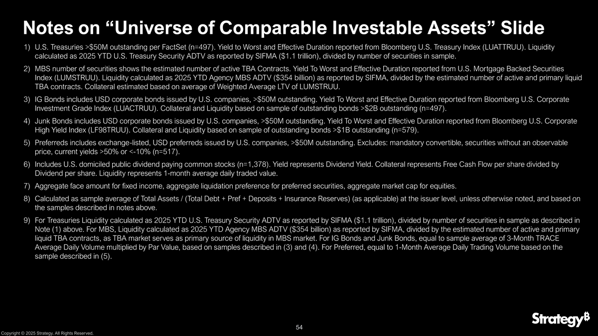 Notes on “Universe of Comparable Investable Assets” Slide 1) U.S. Treasuries >$50M outstanding per FactSet (n=497). Yield to Worst and Effective Duration reported from Bloomberg U.S. Treasury Index (LUATTRUU). Liquidity calculated as 2025 YTD U.S. Treasury Security ADTV as reported by SIFMA ($1.1 trillion), divided by number of securities in sample. 2) MBS number of securities shows the estimated number of active TBA Contracts. Yield To Worst and Effective Duration reported from U.S. Mortgage Backed Securities Index (LUMSTRUU). Liquidity calculated as 2025 YTD Agency MBS ADTV ($354 billion) as reported by SIFMA, divided by the estimated number of active and primary liquid TBA contracts. Collateral estimated based on average of Weighted Average LTV of LUMSTRUU. 3) IG Bonds includes USD corporate bonds issued by U.S. companies, >$50M outstanding. Yield To Worst and Effective Duration reported from Bloomberg U.S. Corporate Investment Grade Index (LUACTRUU). Collateral and Liquidity based on sample of outstanding bonds >$2B outstanding (n=497). 4) Junk Bonds includes USD corporate bonds issued by U.S. companies, >$50M outstanding. Yield To Worst and Effective Duration reported from Bloomberg U.S. Corporate High Yield Index (LF98TRUU). Collateral and Liquidity based on sample of outstanding bonds >$1B outstanding (n=579). 5) Preferreds includes exchange-listed, USD preferreds issued by U.S. companies, >$50M outstanding. Excludes: mandatory convertible, securities without an observable price, current yields >50% or <-10% (n=517). 6) Includes U.S. domiciled public dividend paying common stocks (n=1,378). Yield represents Dividend Yield. Collateral represents Free Cash Flow per share divided by Dividend per share. Liquidity represents 1-month average daily traded value. 7) Aggregate face amount for fixed income, aggregate liquidation preference for preferred securities, aggregate market cap for equities. 8) Calculated as sample average of Total Assets / (Total Debt + Pref + Deposits + Insurance Reserves) (as applicable) at the issuer level, unless otherwise noted, and based on the samples described in notes above. 9) For Treasuries Liquidity calculated as 2025 YTD U.S. Treasury Security ADTV as reported by SIFMA ($1.1 trillion), divided by number of securities in sample as described in Note (1) above. For MBS, Liquidity calculated as 2025 YTD Agency MBS ADTV ($354 billion) as reported by SIFMA, divided by the estimated number of active and primary liquid TBA contracts, as TBA market serves as primary source of liquidity in MBS market. For IG Bonds and Junk Bonds, equal to sample average of 3-Month TRACE Average Daily Volume multiplied by Par Value, based on samples described in (3) and (4). For Preferred, equal to 1-Month Average Daily Trading Volume based on the sample described in (5). 54 Copyright © 2025 Strategy. All Rights Reserved.