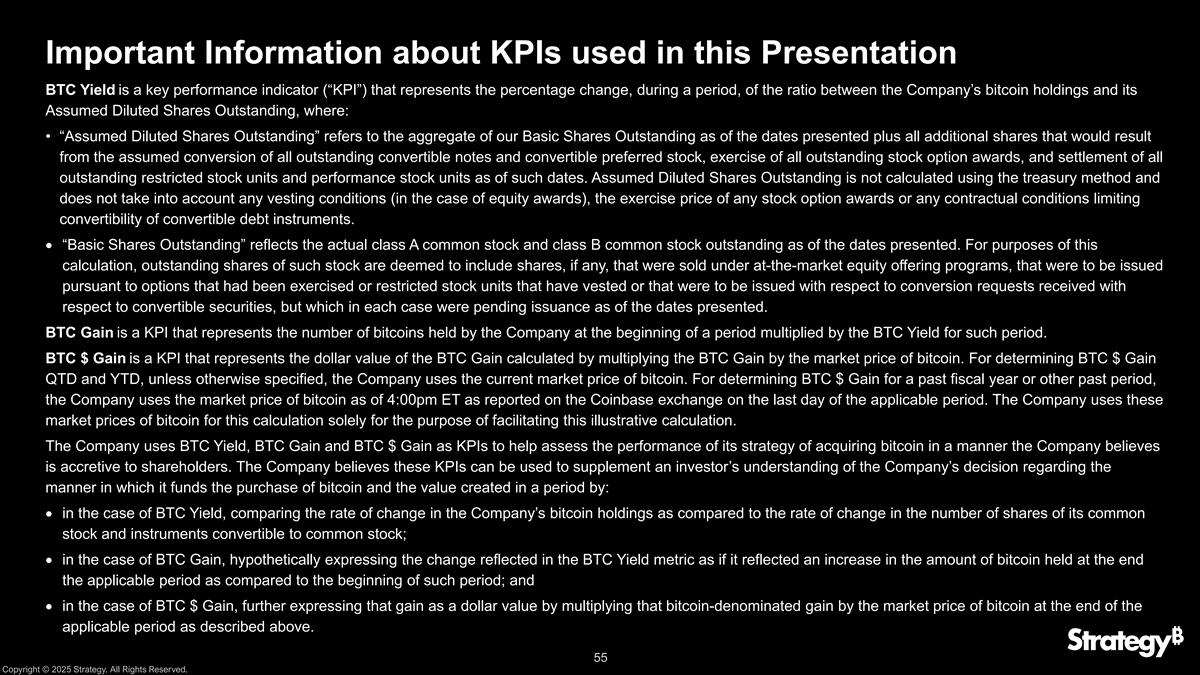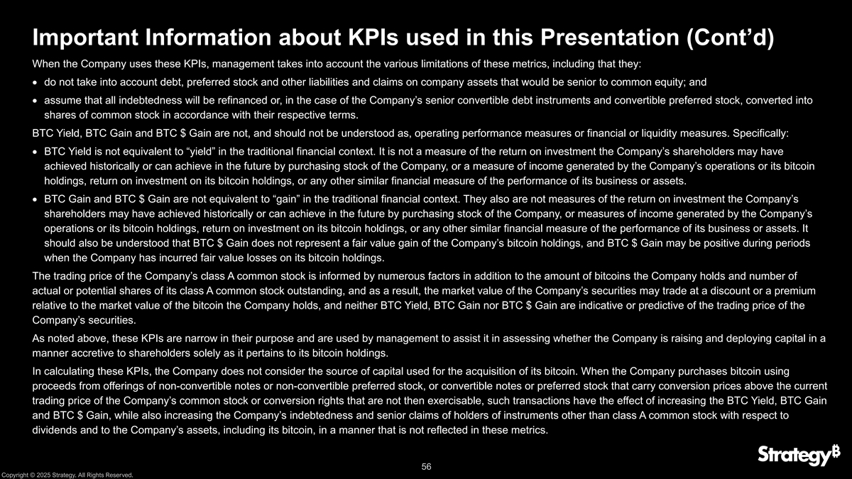 Important Information about KPIs used in this Presentation BTC Yield is a key performance indicator (“KPI”) that represents the percentage change, during a period, of the ratio between the Company’s bitcoin holdings and its Assumed Diluted Shares Outstanding, where: • “Assumed Diluted Shares Outstanding” refers to the aggregate of our Basic Shares Outstanding as of the dates presented plus all additional shares that would result from the assumed conversion of all outstanding convertible notes and convertible preferred stock, exercise of all outstanding stock option awards, and settlement of all outstanding restricted stock units and performance stock units as of such dates. Assumed Diluted Shares Outstanding is not calculated using the treasury method and does not take into account any vesting conditions (in the case of equity awards), the exercise price of any stock option awards or any contractual conditions limiting convertibility of convertible debt instruments. • “Basic Shares Outstanding” reflects the actual class A common stock and class B common stock outstanding as of the dates presented. For purposes of this calculation, outstanding shares of such stock are deemed to include shares, if any, that were sold under at-the-market equity offering programs, that were to be issued pursuant to options that had been exercised or restricted stock units that have vested or that were to be issued with respect to conversion requests received with respect to convertible securities, but which in each case were pending issuance as of the dates presented. BTC Gain is a KPI that represents the number of bitcoins held by the Company at the beginning of a period multiplied by the BTC Yield for such period. BTC $ Gain is a KPI that represents the dollar value of the BTC Gain calculated by multiplying the BTC Gain by the market price of bitcoin. For determining BTC $ Gain QTD and YTD, unless otherwise specified, the Company uses the current market price of bitcoin. For determining BTC $ Gain for a past fiscal year or other past period, the Company uses the market price of bitcoin as of 4:00pm ET as reported on the Coinbase exchange on the last day of the applicable period. The Company uses these market prices of bitcoin for this calculation solely for the purpose of facilitating this illustrative calculation. The Company uses BTC Yield, BTC Gain and BTC $ Gain as KPIs to help assess the performance of its strategy of acquiring bitcoin in a manner the Company believes is accretive to shareholders. The Company believes these KPIs can be used to supplement an investor’s understanding of the Company’s decision regarding the manner in which it funds the purchase of bitcoin and the value created in a period by: • in the case of BTC Yield, comparing the rate of change in the Company’s bitcoin holdings as compared to the rate of change in the number of shares of its common stock and instruments convertible to common stock; • in the case of BTC Gain, hypothetically expressing the change reflected in the BTC Yield metric as if it reflected an increase in the amount of bitcoin held at the end the applicable period as compared to the beginning of such period; and • in the case of BTC $ Gain, further expressing that gain as a dollar value by multiplying that bitcoin-denominated gain by the market price of bitcoin at the end of the applicable period as described above. 55 Copyright © 2025 Strategy. All Rights Reserved.