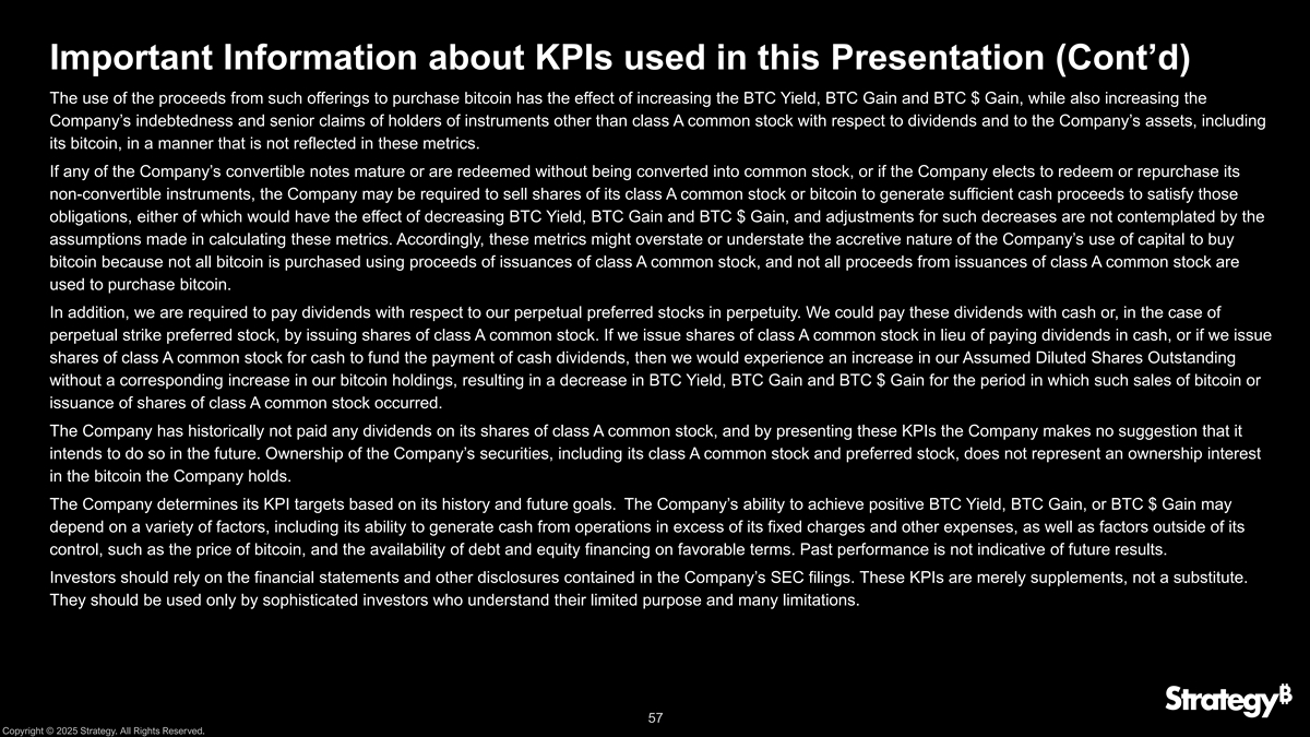 Important Information about KPIs used in this Presentation (Cont’d) When the Company uses these KPIs, management takes into account the various limitations of these metrics, including that they: • do not take into account debt, preferred stock and other liabilities and claims on company assets that would be senior to common equity; and • assume that all indebtedness will be refinanced or, in the case of the Company’s senior convertible debt instruments and convertible preferred stock, converted into shares of common stock in accordance with their respective terms. BTC Yield, BTC Gain and BTC $ Gain are not, and should not be understood as, operating performance measures or financial or liquidity measures. Specifically: • BTC Yield is not equivalent to “yield” in the traditional financial context. It is not a measure of the return on investment the Company’s shareholders may have achieved historically or can achieve in the future by purchasing stock of the Company, or a measure of income generated by the Company’s operations or its bitcoin holdings, return on investment on its bitcoin holdings, or any other similar financial measure of the performance of its business or assets. • BTC Gain and BTC $ Gain are not equivalent to “gain” in the traditional financial context. They also are not measures of the return on investment the Company’s shareholders may have achieved historically or can achieve in the future by purchasing stock of the Company, or measures of income generated by the Company’s operations or its bitcoin holdings, return on investment on its bitcoin holdings, or any other similar financial measure of the performance of its business or assets. It should also be understood that BTC $ Gain does not represent a fair value gain of the Company’s bitcoin holdings, and BTC $ Gain may be positive during periods when the Company has incurred fair value losses on its bitcoin holdings. The trading price of the Company’s class A common stock is informed by numerous factors in addition to the amount of bitcoins the Company holds and number of actual or potential shares of its class A common stock outstanding, and as a result, the market value of the Company’s securities may trade at a discount or a premium relative to the market value of the bitcoin the Company holds, and neither BTC Yield, BTC Gain nor BTC $ Gain are indicative or predictive of the trading price of the Company’s securities. As noted above, these KPIs are narrow in their purpose and are used by management to assist it in assessing whether the Company is raising and deploying capital in a manner accretive to shareholders solely as it pertains to its bitcoin holdings. In calculating these KPIs, the Company does not consider the source of capital used for the acquisition of its bitcoin. When the Company purchases bitcoin using proceeds from offerings of non-convertible notes or non-convertible preferred stock, or convertible notes or preferred stock that carry conversion prices above the current trading price of the Company’s common stock or conversion rights that are not then exercisable, such transactions have the effect of increasing the BTC Yield, BTC Gain and BTC $ Gain, while also increasing the Company’s indebtedness and senior claims of holders of instruments other than class A common stock with respect to dividends and to the Company’s assets, including its bitcoin, in a manner that is not reflected in these metrics. 56 Copyright © 2025 Strategy. All Rights Reserved.