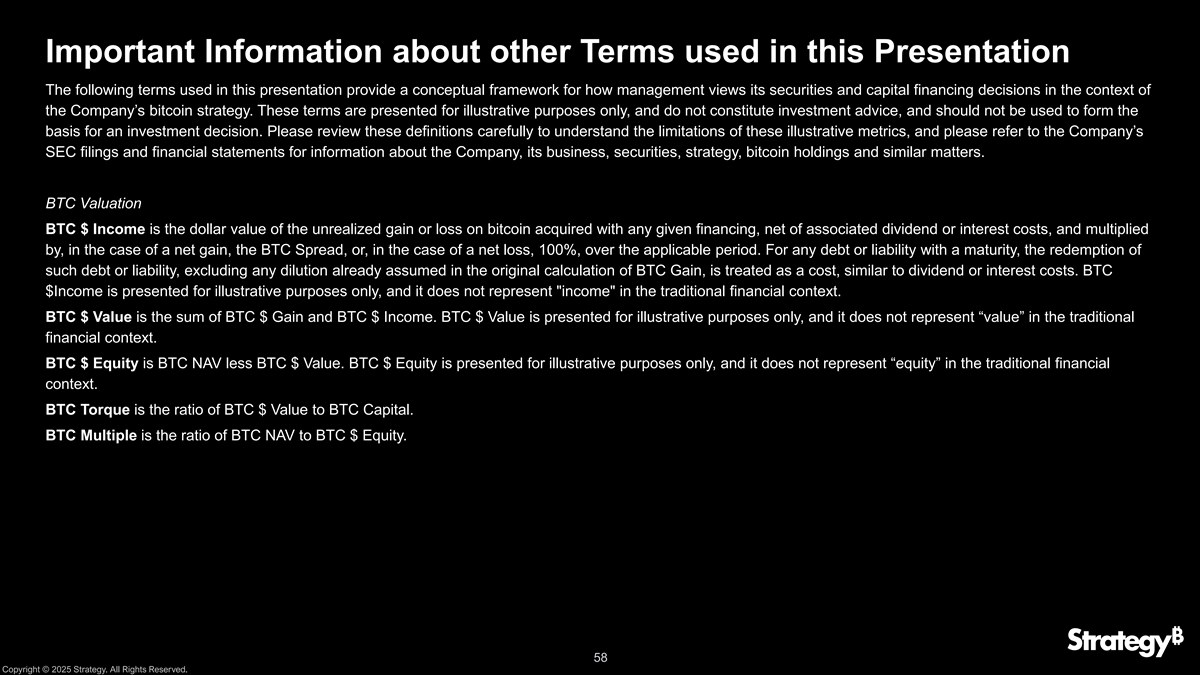 Important Information about KPIs used in this Presentation (Cont’d) The use of the proceeds from such offerings to purchase bitcoin has the effect of increasing the BTC Yield, BTC Gain and BTC $ Gain, while also increasing the Company’s indebtedness and senior claims of holders of instruments other than class A common stock with respect to dividends and to the Company’s assets, including its bitcoin, in a manner that is not reflected in these metrics. If any of the Company’s convertible notes mature or are redeemed without being converted into common stock, or if the Company elects to redeem or repurchase its non-convertible instruments, the Company may be required to sell shares of its class A common stock or bitcoin to generate sufficient cash proceeds to satisfy those obligations, either of which would have the effect of decreasing BTC Yield, BTC Gain and BTC $ Gain, and adjustments for such decreases are not contemplated by the assumptions made in calculating these metrics. Accordingly, these metrics might overstate or understate the accretive nature of the Company’s use of capital to buy bitcoin because not all bitcoin is purchased using proceeds of issuances of class A common stock, and not all proceeds from issuances of class A common stock are used to purchase bitcoin. In addition, we are required to pay dividends with respect to our perpetual preferred stocks in perpetuity. We could pay these dividends with cash or, in the case of perpetual strike preferred stock, by issuing shares of class A common stock. If we issue shares of class A common stock in lieu of paying dividends in cash, or if we issue shares of class A common stock for cash to fund the payment of cash dividends, then we would experience an increase in our Assumed Diluted Shares Outstanding without a corresponding increase in our bitcoin holdings, resulting in a decrease in BTC Yield, BTC Gain and BTC $ Gain for the period in which such sales of bitcoin or issuance of shares of class A common stock occurred. The Company has historically not paid any dividends on its shares of class A common stock, and by presenting these KPIs the Company makes no suggestion that it intends to do so in the future. Ownership of the Company’s securities, including its class A common stock and preferred stock, does not represent an ownership interest in the bitcoin the Company holds. The Company determines its KPI targets based on its history and future goals. The Company’s ability to achieve positive BTC Yield, BTC Gain, or BTC $ Gain may depend on a variety of factors, including its ability to generate cash from operations in excess of its fixed charges and other expenses, as well as factors outside of its control, such as the price of bitcoin, and the availability of debt and equity financing on favorable terms. Past performance is not indicative of future results. Investors should rely on the financial statements and other disclosures contained in the Company’s SEC filings. These KPIs are merely supplements, not a substitute. They should be used only by sophisticated investors who understand their limited purpose and many limitations. 57 Copyright © 2025 Strategy. All Rights Reserved.