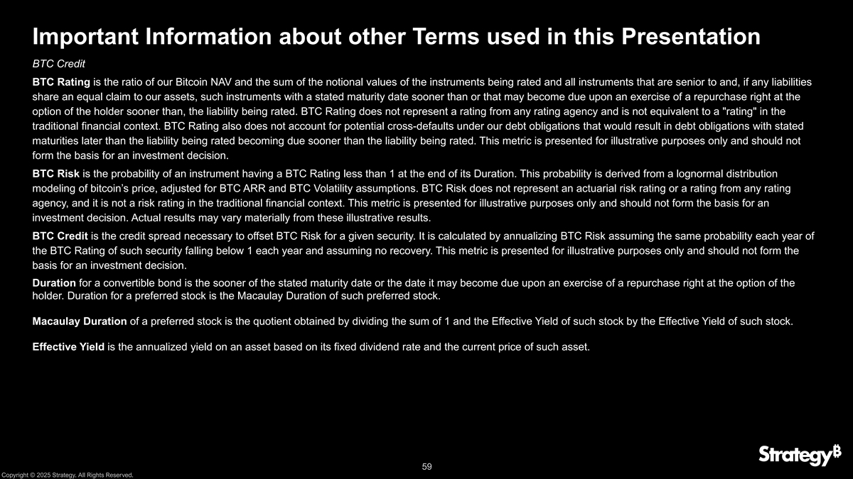 Important Information about other Terms used in this Presentation The following terms used in this presentation provide a conceptual framework for how management views its securities and capital financing decisions in the context of the Company’s bitcoin strategy. These terms are presented for illustrative purposes only, and do not constitute investment advice, and should not be used to form the basis for an investment decision. Please review these definitions carefully to understand the limitations of these illustrative metrics, and please refer to the Company’s SEC filings and financial statements for information about the Company, its business, securities, strategy, bitcoin holdings and similar matters. BTC Valuation BTC $ Income is the dollar value of the unrealized gain or loss on bitcoin acquired with any given financing, net of associated dividend or interest costs, and multiplied by, in the case of a net gain, the BTC Spread, or, in the case of a net loss, 100%, over the applicable period. For any debt or liability with a maturity, the redemption of such debt or liability, excluding any dilution already assumed in the original calculation of BTC Gain, is treated as a cost, similar to dividend or interest costs. BTC $Income is presented for illustrative purposes only, and it does not represent income in the traditional financial context. BTC $ Value is the sum of BTC $ Gain and BTC $ Income. BTC $ Value is presented for illustrative purposes only, and it does not represent “value” in the traditional financial context. BTC $ Equity is BTC NAV less BTC $ Value. BTC $ Equity is presented for illustrative purposes only, and it does not represent “equity” in the traditional financial context. BTC Torque is the ratio of BTC $ Value to BTC Capital. BTC Multiple is the ratio of BTC NAV to BTC $ Equity. 58 Copyright © 2025 Strategy. All Rights Reserved.