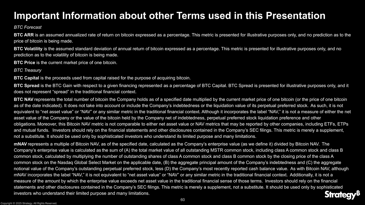 Important Information about other Terms used in this Presentation BTC Credit BTC Rating is the ratio of our Bitcoin NAV and the sum of the notional values of the instruments being rated and all instruments that are senior to and, if any liabilities share an equal claim to our assets, such instruments with a stated maturity date sooner than or that may become due upon an exercise of a repurchase right at the option of the holder sooner than, the liability being rated. BTC Rating does not represent a rating from any rating agency and is not equivalent to a rating in the traditional financial context. BTC Rating also does not account for potential cross-defaults under our debt obligations that would result in debt obligations with stated maturities later than the liability being rated becoming due sooner than the liability being rated. This metric is presented for illustrative purposes only and should not form the basis for an investment decision. BTC Risk is the probability of an instrument having a BTC Rating less than 1 at the end of its Duration. This probability is derived from a lognormal distribution modeling of bitcoin’s price, adjusted for BTC ARR and BTC Volatility assumptions. BTC Risk does not represent an actuarial risk rating or a rating from any rating agency, and it is not a risk rating in the traditional financial context. This metric is presented for illustrative purposes only and should not form the basis for an investment decision. Actual results may vary materially from these illustrative results. BTC Credit is the credit spread necessary to offset BTC Risk for a given security. It is calculated by annualizing BTC Risk assuming the same probability each year of the BTC Rating of such security falling below 1 each year and assuming no recovery. This metric is presented for illustrative purposes only and should not form the basis for an investment decision. Duration for a convertible bond is the sooner of the stated maturity date or the date it may become due upon an exercise of a repurchase right at the option of the holder. Duration for a preferred stock is the Macaulay Duration of such preferred stock. Macaulay Duration of a preferred stock is the quotient obtained by dividing the sum of 1 and the Effective Yield of such stock by the Effective Yield of such stock. Effective Yield is the annualized yield on an asset based on its fixed dividend rate and the current price of such asset. 59 Copyright © 2025 Strategy. All Rights Reserved.