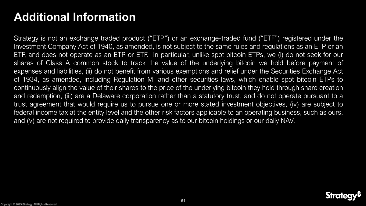 Additional Information Strategy is not an exchange traded product (“ETP”) or an exchange-traded fund (“ETF”) registered under the Investment Company Act of 1940, as amended, is not subject to the same rules and regulations as an ETP or an ETF, and does not operate as an ETP or ETF. In particular, unlike spot bitcoin ETPs, we (i) do not seek for our shares of Class A common stock to track the value of the underlying bitcoin we hold before payment of expenses and liabilities, (ii) do not benefit from various exemptions and relief under the Securities Exchange Act of 1934, as amended, including Regulation M, and other securities laws, which enable spot bitcoin ETPs to continuously align the value of their shares to the price of the underlying bitcoin they hold through share creation and redemption, (iii) are a Delaware corporation rather than a statutory trust, and do not operate pursuant to a trust agreement that would require us to pursue one or more stated investment objectives, (iv) are subject to federal income tax at the entity level and the other risk factors applicable to an operating business, such as ours, and (v) are not required to provide daily transparency as to our bitcoin holdings or our daily NAV. 61 Copyright © 2025 Strategy. All Rights Reserved.