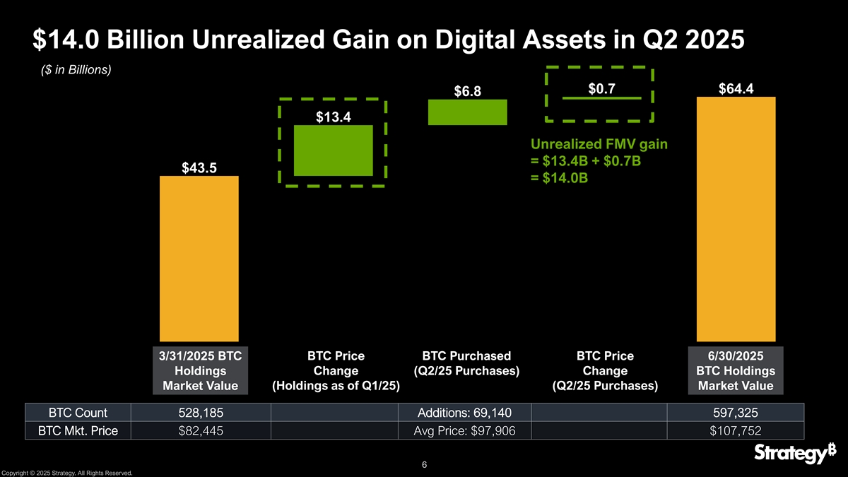 The BTC $ Gain is an even more important metric for a company of our size. We have an annual target of $15 billion, and we’re about two thirds of the way through that halfway through the year with a BTC $ Gain of $9.6 billion. A topic of big discussion or significant discussion about Strategy is our adoption of a new accounting standard from FASB that allows us to mark our bitcoin holdings to market. And what you see as the effect of that, at the end of Q2 2025 is a $13.4 billion gain on the bitcoin price changes of our holdings at the end of Q1 2025, and also an additional $0.7 billion gain on the bitcoin that we purchased during the quarter.