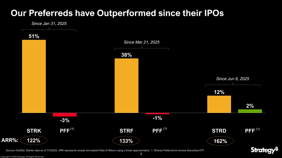 Strong Performance for STRK, STRF, & STRD since Launch STRK +51% $120.4 +$477M ATM Sales $117.7 STRF +38% +$163M ATM Sales $2.00 div/share $2.64 div/share $85.0 STRD +12% $95.3 launch $1.24 div/share $85.0 launch $80.0 launch 1/31/25 2/28/25 3/31/25 4/30/25 5/31/25 6/3 70/ /325 /2025 Past performance is not indicative of future results. Performance reflects initial offering prices of $80.00 (STRK) and $85.00 (STRF, STRD). ‘Launch price’ refers to the initial offering price. Charted prices represent daily closing prices. 7 Copyright © 2025 Strategy. All Rights Reserved.