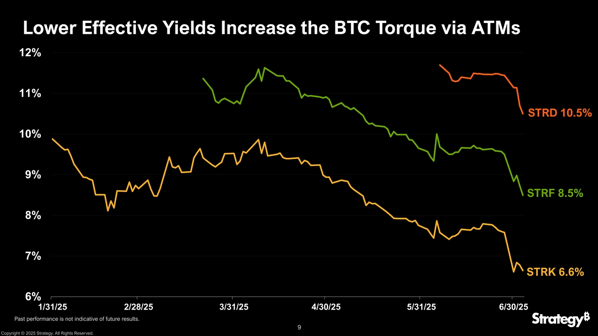 The other thing that you will see here is as the effective yields of these instruments decrease, it means that Bitcoin Torque is increasing via the ATMs. It means that we are able to produce more BTC yield as we issue ATMs on STRD, STRF, and STRK.