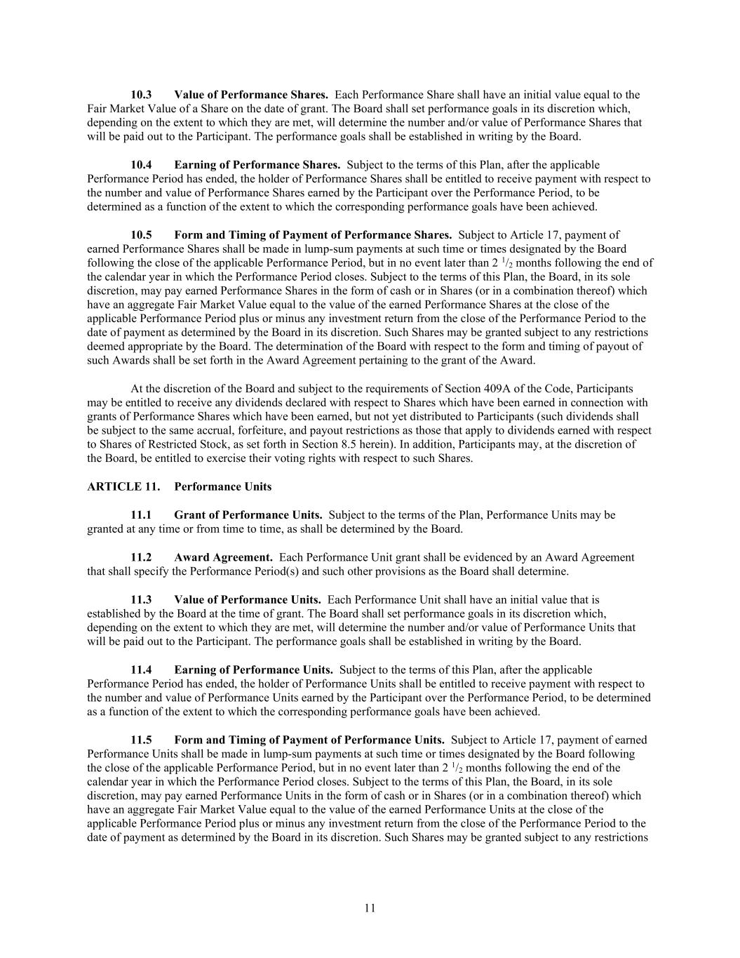 11 10.3 Value of Performance Shares. Each Performance Share shall have an initial value equal to the Fair Market Value of a Share on the date of grant. The Board shall set performance goals in its discretion which, depending on the extent to which they are met, will determine the number and/or value of Performance Shares that will be paid out to the Participant. The performance goals shall be established in writing by the Board. 10.4 Earning of Performance Shares. Subject to the terms of this Plan, after the applicable Performance Period has ended, the holder of Performance Shares shall be entitled to receive payment with respect to the number and value of Performance Shares earned by the Participant over the Performance Period, to be determined as a function of the extent to which the corresponding performance goals have been achieved. 10.5 Form and Timing of Payment of Performance Shares. Subject to Article 17, payment of earned Performance Shares shall be made in lump-sum payments at such time or times designated by the Board following the close of the applicable Performance Period, but in no event later than 2 1/2 months following the end of the calendar year in which the Performance Period closes. Subject to the terms of this Plan, the Board, in its sole discretion, may pay earned Performance Shares in the form of cash or in Shares (or in a combination thereof) which have an aggregate Fair Market Value equal to the value of the earned Performance Shares at the close of the applicable Performance Period plus or minus any investment return from the close of the Performance Period to the date of payment as determined by the Board in its discretion. Such Shares may be granted subject to any restrictions deemed appropriate by the Board. The determination of the Board with respect to the form and timing of payout of such Awards shall be set forth in the Award Agreement pertaining to the grant of the Award. At the discretion of the Board and subject to the requirements of Section 409A of the Code, Participants may be entitled to receive any dividends declared with respect to Shares which have been earned in connection with grants of Performance Shares which have been earned, but not yet distributed to Participants (such dividends shall be subject to the same accrual, forfeiture, and payout restrictions as those that apply to dividends earned with respect to Shares of Restricted Stock, as set forth in Section 8.5 herein). In addition, Participants may, at the discretion of the Board, be entitled to exercise their voting rights with respect to such Shares. ARTICLE 11. Performance Units 11.1 Grant of Performance Units. Subject to the terms of the Plan, Performance Units may be granted at any time or from time to time, as shall be determined by the Board. 11.2 Award Agreement. Each Performance Unit grant shall be evidenced by an Award Agreement that shall specify the Performance Period(s) and such other provisions as the Board shall determine. 11.3 Value of Performance Units. Each Performance Unit shall have an initial value that is established by the Board at the time of grant. The Board shall set performance goals in its discretion which, depending on the extent to which they are met, will determine the number and/or value of Performance Units that will be paid out to the Participant. The performance goals shall be established in writing by the Board. 11.4 Earning of Performance Units. Subject to the terms of this Plan, after the applicable Performance Period has ended, the holder of Performance Units shall be entitled to receive payment with respect to the number and value of Performance Units earned by the Participant over the Performance Period, to be determined as a function of the extent to which the corresponding performance goals have been achieved. 11.5 Form and Timing of Payment of Performance Units. Subject to Article 17, payment of earned Performance Units shall be made in lump-sum payments at such time or times designated by the Board following the close of the applicable Performance Period, but in no event later than 2 1/2 months following the end of the calendar year in which the Performance Period closes. Subject to the terms of this Plan, the Board, in its sole discretion, may pay earned Performance Units in the form of cash or in Shares (or in a combination thereof) which have an aggregate Fair Market Value equal to the value of the earned Performance Units at the close of the applicable Performance Period plus or minus any investment return from the close of the Performance Period to the date of payment as determined by the Board in its discretion. Such Shares may be granted subject to any restrictions