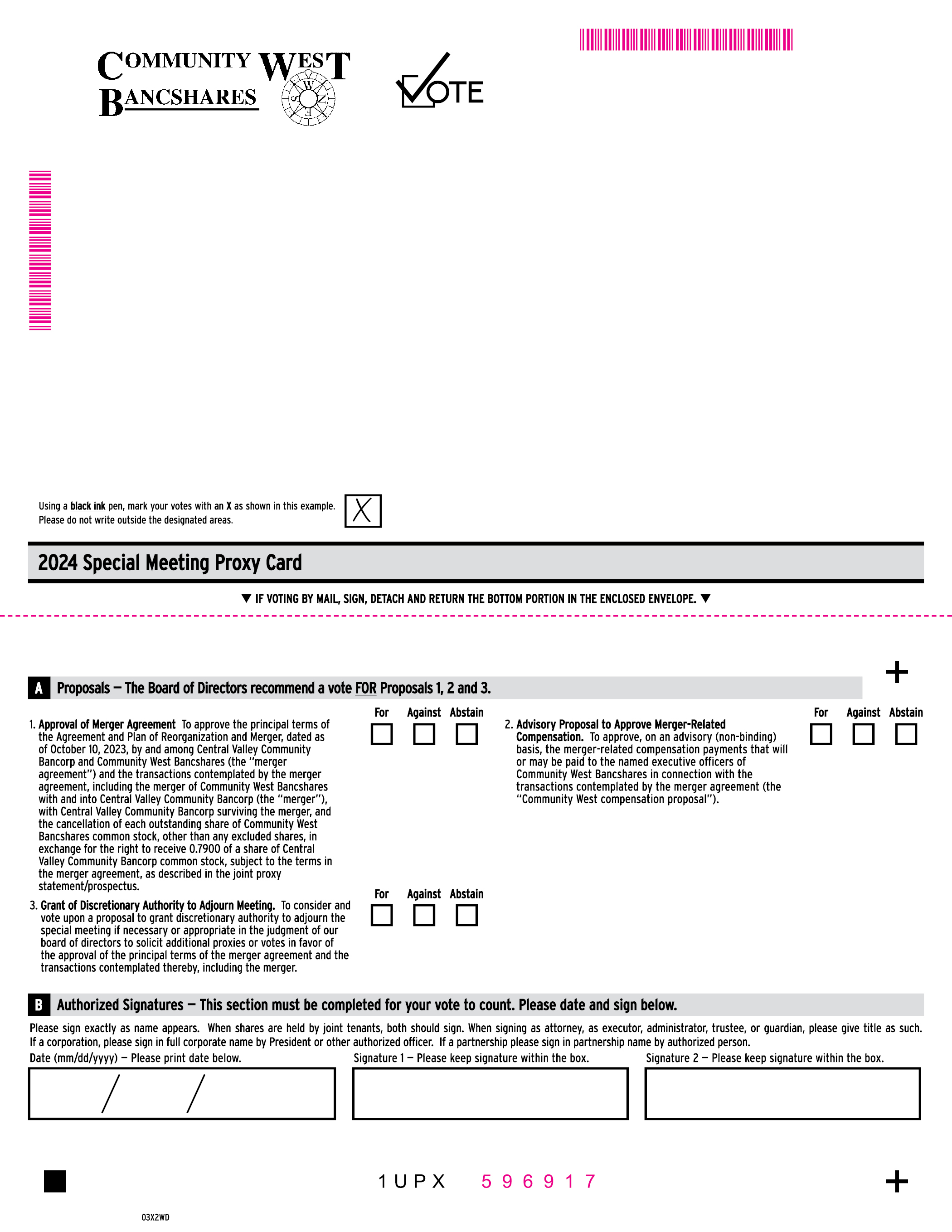 Using a black ink pen, mark your votes with an X as shown in this example. Please do not write outside the designated areas. 2024 Special Meeting Proxy Card IF VOTING BY MAIL, SIGN, DETACH AND RETURN THE BOTTOM PORTION IN THE ENCLOSED ENVELOPE. For Against Abstain For Against Abstain Proposals — The Board of Directors recommend a vote FOR Proposals 1, 2 and 3. A 1. Approval of Merger Agreement To approve the principal terms of the Agreement and Plan of Reorganization and Merger, dated as of October 10, 2023, by and among Central Valley Community Bancorp and Community West Bancshares (the “merger agreement”) and the transactions contemplated by the merger agreement, including the merger of Community West Bancshares with and into Central Valley Community Bancorp (the “merger”), with Central Valley Community Bancorp surviving the merger, and the cancellation of each outstanding share of Community West Bancshares common stock, other than any excluded shares, in exchange for the right to receive 0.7900 of a share of Central Valley Community Bancorp common stock, subject to the terms in the merger agreement, as described in the joint proxy statement/prospectus. 3. Grant of Discretionary Authority to Adjourn Meeting. To consider and vote upon a proposal to grant discretionary authority to adjourn the special meeting if necessary or appropriate in the judgment of our board of directors to solicit additional proxies or votes in favor of the approval of the principal terms of the merger agreement and the transactions contemplated thereby, including the merger. 2. Advisory Proposal to Approve Merger-Related Compensation. To approve, on an advisory (non-binding) basis, the merger-related compensation payments that will or may be paid to the named executive officers of Community West Bancshares in connection with the transactions contemplated by the merger agreement (the “Community West compensation proposal”). For Against Abstain B Authorized Signatures — This section must be completed for your vote to count. Please date and sign below. Please sign exactly as name appears. When shares are held by joint tenants, both should sign. When signing as attorney, as executor, administrator, trustee, or guardian, please give title as such. If a corporation, please sign in full corporate name by President or other authorized officer. If a partnership please sign in partnership name by authorized person. Date (mm/dd/yyyy) — Please print date below. Signature 1 — Please keep signature within the box. Signature 2 — Please keep signature within the box. 1UPX 596917 03X2WD