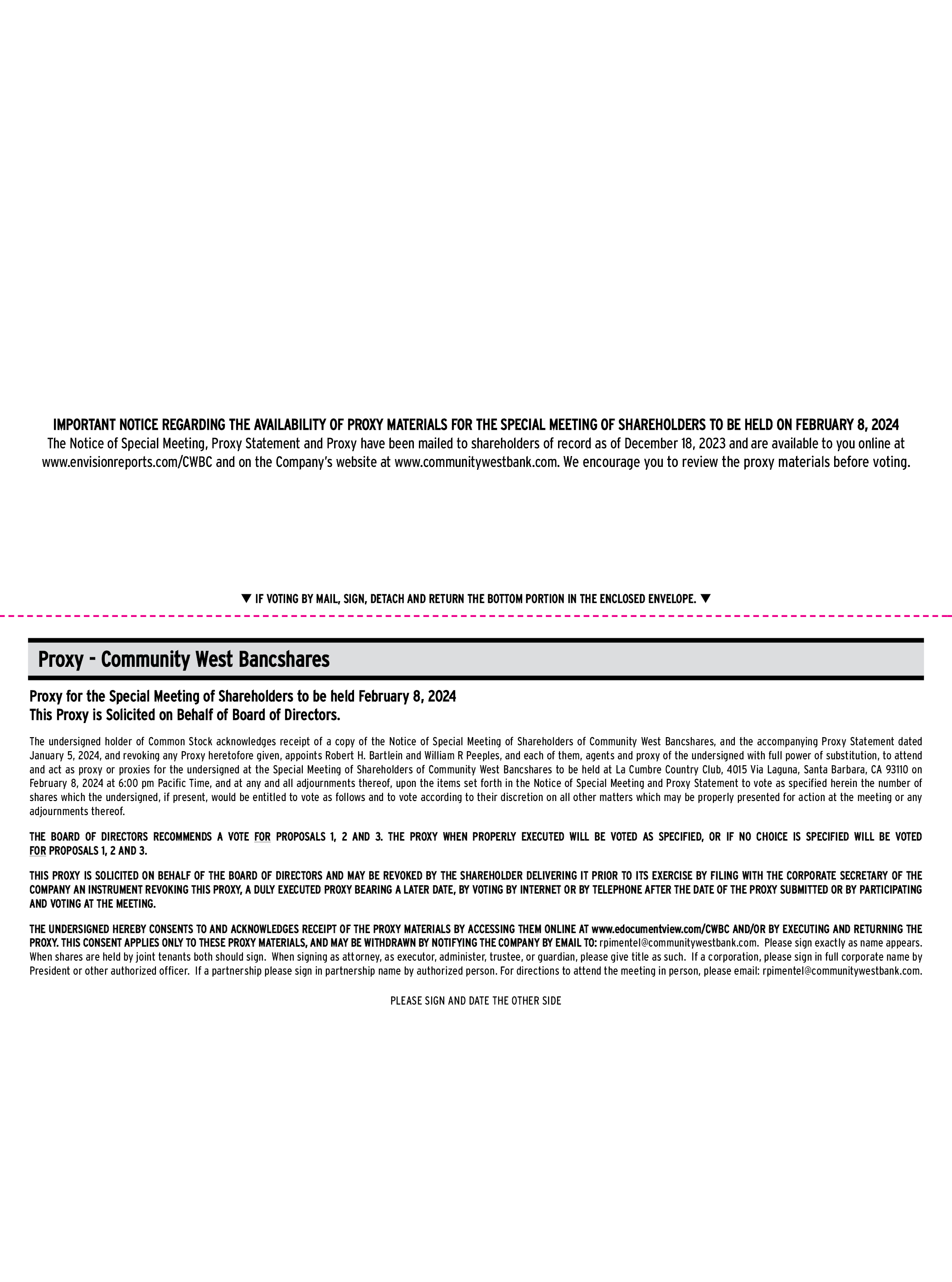 IMPORTANT NOTICE REGARDING THE AVAILABILITY OF PROXY MATERIALS FOR THE SPECIAL MEETING OF SHAREHOLDERS TO BE HELD ON FEBRUARY 8, 2024 The Notice of Special Meeting, Proxy Statement and Proxy have been mailed to shareholders of record as of December 18, 2023 and are available to you online at www.envisionreports.com/CWBC and on the Company’s website at www.communitywestbank.com. We encourage you to review the proxy materials before voting. IF VOTING BY MAIL, SIGN, DETACH AND RETURN THE BOTTOM PORTION IN THE ENCLOSED ENVELOPE. • Proxy -Community West Bancshares Proxy for the Special Meeting of Shareholders to be held February 8, 2024 This Proxy is Solicited on Behalf of Board of Directors. The undersigned holder of Common Stock acknowledges receipt of a copy of the Notice of Special Meeting of Shareholders of Community West Bancshares, and the accompanying Proxy Statement dated January 5, 2024, and revoking any Proxy heretofore given, appoints Robert H. Bartlein and William R Peeples, and each of them, agents and proxy of the undersigned with full power of substitution, to attend and act as proxy or proxies for the undersigned at the Special Meeting of Shareholders of Community West Bancshares to be held at La Cumbre Country Club, 4015 Via Laguna, Santa Barbara, CA 93110 on February 8, 2024 at 6:00 pm Pacific Time, and at any and all adjournments thereof, upon the items set forth in the Notice of Special Meeting and Proxy Statement to vote as specified herein the number of shares which the undersigned, if present, would be entitled to vote as follows and to vote according to their discretion on all other matters which may be properly presented for action at the meeting or any adjournments thereof. THE BOARD OF DIRECTORS RECOMMENDS A VOTE FOR PROPOSALS 1, 2 AND 3. THE PROXY WHEN PROPERLY EXECUTED WILL BE VOTED AS SPECIFIED, OR IF NO CHOICE IS SPECIFIED WILL BE VOTED FOR PROPOSALS 1, 2 AND 3. THIS PROXY IS SOLICITED ON BEHALF OF THE BOARD OF DIRECTORS AND MAY BE REVOKED BY THE SHAREHOLDER DELIVERING IT PRIOR TO ITS EXERCISE BY FILING WITH THE CORPORATE SECRETARY OF THE COMPANY AN INSTRUMENT REVOKING THIS PROXY, A DULY EXECUTED PROXY BEARING A LATER DATE, BY VOTING BY INTERNET OR BY TELEPHONE AFTER THE DATE OF THE PROXY SUBMITTED OR BY PARTICIPATING AND VOTING AT THE MEETING. THE UNDERSIGNED HEREBY CONSENTS TO AND ACKNOWLEDGES RECEIPT OF THE PROXY MATERIALS BY ACCESSING THEM ONLINE AT www.edocumentview.com/CWBC AND/OR BY EXECUTING AND RETURNING THE PROXY. THIS CONSENT APPLIES ONLY TO THESE PROXY MATERIALS, AND MAY BE WITHDRAWN BY NOTIFYING THE COMPANY BY EMAIL TO: rpimentel@communitywestbank.com. Please sign exactly as name appears. When shares are held by joint tenants both should sign. When signing as attorney, as executor, administer, trustee, or guardian, please give title as such. If a corporation, please sign in full corporate name by President or other authorized officer. If a partnership please sign in partnership name by authorized person. For directions to attend the meeting in person, please email: rpimentel@communitywestbank.com. PLEASE SIGN AND DATE THE OTHER SIDE