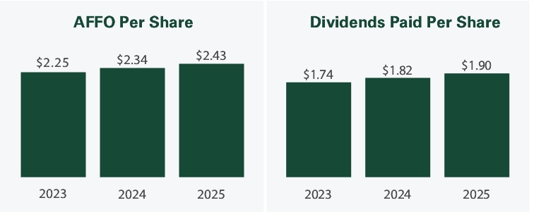 Year(1) | Summary Compensation Table Total for PEO ($)(2) | Compensation Actually Paid to PEO ($)(3) | Average Summary Compensation Table Total for Non-PEO Named Executive Officers ($)(4) | Average Compensation Actually Paid to Non-PEO Named Executive Officers ($)(5) | Total Shareholder Return ($)(6) | Peer Group Total Shareholder Return ($)(6)(7) | Net Income ($) (in thousands)(8) | AFFO ($) per share(9) | ||||||||||||||||||