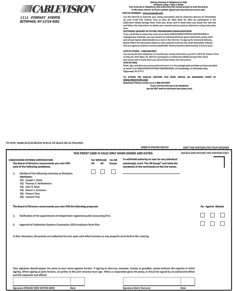 BETHPAGE, NY 11714-3581 Vote by Internet or Telephone or Mail 24 Hours a Day, 7 Days a Week Your Internet or telephone vote authorizes the named proxies to vote the shares in the same manner as if you marked, signed and returned your proxy card. VOTE BY INTERNET - www.proxyvote.com Use the Internet to transmit your voting instructions and for electronic delivery of information up until 11:59 P.M. Eastern Time on May 20, 2015 (May 19, 2015 for participants in the Cablevision 401(k) Savings Plan). Have your proxy card in hand when you access the web site and follow the instructions to obtain your records and to create an electronic voting instruction form. ELECTRONIC DELIVERY OF FUTURE STOCKHOLDER COMMUNICATIONS If you would like to reduce the costs incurred by CABLEVISION SYSTEMS CORPORATION in mailing proxy materials, you can consent to receiving all future proxy statements, proxy cards and annual reports electronically via e-mail or the Internet. To sign up for electronic delivery, please follow the instructions above to vote using the Internet and, when prompted, indicate that you agree to receive or access stockholder communications electronically in future years. VOTE BY PHONE - 1-800-690-6903 Use any touch-tone telephone to transmit your voting instructions up until 11:59 P.M. Eastern Time on May 20, 2015 (May 19, 2015 for participants in Cablevision 401(k) Savings Plan). Have your proxy card in hand when you call and then follow the instructions. VOTE BY MAIL Mark, sign, and date your proxy card and return it in the postage-paid envelope we have provided or return it to CABLEVISION SYSTEMS CORPORATION, c/o Broadridge, 51 Mercedes Way, Edgewood, NY 11717. TO ATTEND THE ANNUAL MEETING YOU MUST OBTAIN AN ADMISSION TICKET AT WWW.PROXYVOTE.COM Questions? Please contact us at 1-866-232-3037 If you vote by Internet or by telephone you do NOT need to mail back your proxy card. TO VOTE, MARK BLOCKS BELOW IN BLUE OR BLACK INK AS FOLLOWS: M88675-P64304-Z65224 KEEP THIS PORTION FOR YOUR RECORDS THIS PROXY CARD IS VALID ONLY WHEN SIGNED AND DATED. DETACH AND RETURN THIS PORTION ONLY CABLEVISION SYSTEMS CORPORATION For Withhold For All To withhold authority to vote for any individual The Board of Directors recommends you vote FOR All All Except nominee(s), mark “For All Except” and write the each of the following candidates: number(s) of the nominee(s) on the line below. 1. Election of the following nominees as Directors: Nominees: 01) Joseph J. Lhota 02) Thomas V. Reifenheiser 03) John R. Ryan 04) Steven J. Simmons 05) Vincent Tese 06) Leonard Tow The Board of Directors recommends you vote FOR the following proposals: For Against Abstain 2. Ratification of the appointment of independent registered public accounting firm. 3. Approval of Cablevision Systems Corporation 2015 Employee Stock Plan. In their discretion, the proxies are authorized to vote upon such other business as may properly come before the meeting. Your signature should appear the same as your name appears hereon. If signing as attorney, executor, trustee or guardian, please indicate the capacity in which signing. When signing as joint tenants, all parties to the joint tenancy must sign. When a corporation gives the proxy, it should be signed by an authorized officer and the corporate seal affixed. Signature [PLEASE SIGN WITHIN BOX] Date Signature (Joint Owners) Date