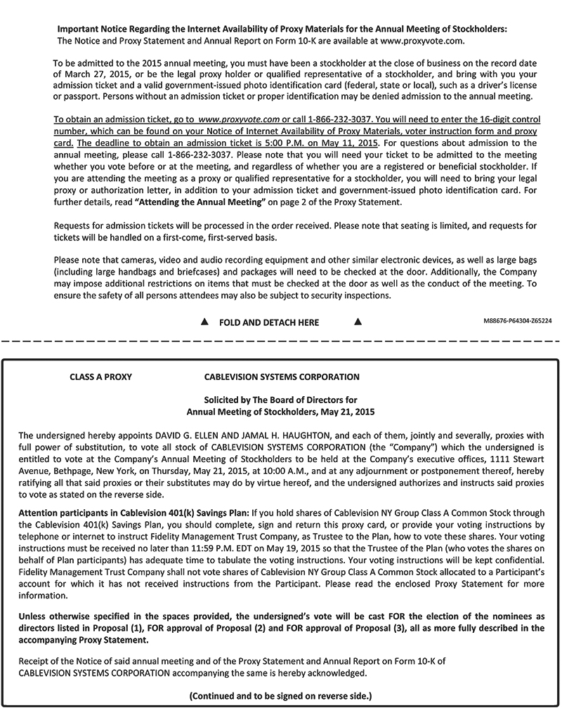 Important Notice Regarding the Internet Availability of Proxy Materials for the Annual Meeting of Stockholders: The Notice and Proxy Statement and Annual Report on Form 10-K are available at www.proxyvote.com. To be admitted to the 2015 annual meeting, you must have been a stockholder at the close of business on the record date of March 27, 2015, or be the legal proxy holder or qualified representative of a stockholder, and bring with you your admission ticket and a valid government-issued photo identification card (federal, state or local), such as a driver’s license or passport. Persons without an admission ticket or proper identification may be denied admission to the annual meeting. To obtain an admission ticket, go to www.proxyvote.com or call 1-866-232-3037. You will need to enter the 16-digit control number, which can be found on your Notice of Internet Availability of Proxy Materials, voter instruction form and proxy card. The deadline to obtain an admission ticket is 5:00 P.M. on May 11, 2015. For questions about admission to the annual meeting, please call 1-866-232-3037. Please note that you will need your ticket to be admitted to the meeting whether you vote before or at the meeting, and regardless of whether you are a registered or beneficial stockholder. If you are attending the meeting as a proxy or qualified representative for a stockholder, you will need to bring your legal proxy or authorization letter, in addition to your admission ticket and government-issued photo identification card. For further details, read “Attending the Annual Meeting” on page 2 of the Proxy Statement. Requests for admission tickets will be processed in the order received. Please note that seating is limited, and requests for tickets will be handled on a first-come, first-served basis. Please note that cameras, video and audio recording equipment and other similar electronic devices, as well as large bags (including large handbags and briefcases) and packages will need to be checked at the door. Additionally, the Company may impose additional restrictions on items that must be checked at the door as well as the conduct of the meeting. To ensure the safety of all persons attendees may also be subject to security inspections. FOLD AND DETACH HERE M88676-P64304-Z65224 CLASS A PROXY CABLEVISION SYSTEMS CORPORATION Solicited by The Board of Directors for Annual Meeting of Stockholders, May 21, 2015 The undersigned hereby appoints DAVID G. ELLEN AND JAMAL H. HAUGHTON, and each of them, jointly and severally, proxies with full power of substitution, to vote all stock of CABLEVISION SYSTEMS CORPORATION (the “Company”) which the undersigned is entitled to vote at the Company’s Annual Meeting of Stockholders to be held at the Company’s executive offices, 1111 Stewart Avenue, Bethpage, New York, on Thursday, May 21, 2015, at 10:00 A.M., and at any adjournment or postponement thereof, hereby ratifying all that said proxies or their substitutes may do by virtue hereof, and the undersigned authorizes and instructs said proxies to vote as stated on the reverse side. Attention participants in Cablevision 401(k) Savings Plan: If you hold shares of Cablevision NY Group Class A Common Stock through the Cablevision 401(k) Savings Plan, you should complete, sign and return this proxy card, or provide your voting instructions by telephone or internet to instruct Fidelity Management Trust Company, as Trustee to the Plan, how to vote these shares. Your voting instructions must be received no later than 11:59 P.M. EDT on May 19, 2015 so that the Trustee of the Plan (who votes the shares on behalf of Plan participants) has adequate time to tabulate the voting instructions. Your voting instructions will be kept confidential. Fidelity Management Trust Company shall not vote shares of Cablevision NY Group Class A Common Stock allocated to a Participant’s account for which it has not received instructions from the Participant. Please read the enclosed Proxy Statement for more information. Unless otherwise specified in the spaces provided, the undersigned’s vote will be cast FOR the election of the nominees as directors listed in Proposal (1), FOR approval of Proposal (2) and FOR approval of Proposal (3), all as more fully described in the accompanying Proxy Statement. Receipt of the Notice of said annual meeting and of the Proxy Statement and Annual Report on Form 10-K of CABLEVISION SYSTEMS CORPORATION accompanying the same is hereby acknowledged. (Continued and to be signed on reverse side.)