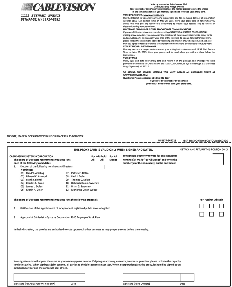 BETHPAGE, NY 11714-3581 Vote by Internet or Telephone or Mail 24 Hours a Day, 7 Days a Week Your Internet or telephone vote authorizes the named proxies to vote the shares in the same manner as if you marked, signed and returned your proxy card. VOTE BY INTERNET - www.proxyvote.com Use the Internet to transmit your voting instructions and for electronic delivery of information up until 11:59 P.M. Eastern Time on May 20, 2015. Have your proxy card in hand when you access the web site and follow the instructions to obtain your records and to create an electronic voting instruction form. ELECTRONIC DELIVERY OF FUTURE STOCKHOLDER COMMUNICATIONS If you would like to reduce the costs incurred by CABLEVISION SYSTEMS CORPORATION in mailing proxy materials, you can consent to receiving all future proxy statements, proxy cards and annual reports electronically via e-mail or the Internet. To sign up for electronic delivery, please follow the instructions above to vote using the Internet and, when prompted, indicate that you agree to receive or access stockholder communications electronically in future years. VOTE BY PHONE - 1-800-690-6903 Use any touch-tone telephone to transmit your voting instructions up until 11:59 P.M. Eastern Time on May 20, 2015. Have your proxy card in hand when you call and then follow the instructions. VOTE BY MAIL Mark, sign, and date your proxy card and return it in the postage-paid envelope we have provided or return it to CABLEVISION SYSTEMS CORPORATION, c/o Broadridge, 51 Mercedes Way, Edgewood, NY 11717. TO ATTEND THE ANNUAL MEETING YOU MUST OBTAIN AN ADMISSION TICKET AT WWW.PROXYVOTE.COM Questions? Please contact us at 1-866-232-3037 If you vote by Internet or by telephone you do NOT need to mail back your proxy card. TO VOTE, MARK BLOCKS BELOW IN BLUE OR BLACK INK AS FOLLOWS: M88677-Z65223 KEEP THIS PORTION FOR YOUR RECORDS THIS PROXY CARD IS VALID ONLY WHEN SIGNED AND DATED. DETACH AND RETURN THIS PORTION ONLY CABLEVISION SYSTEMS CORPORATION For Withhold For All To withhold authority to vote for any individual The Board of Directors recommends you vote FOR All All Except nominee(s), mark “For All Except” and write the each of the following candidates: number(s) of the nominee(s) on the line below. 1. Election of the following nominees as Directors: Nominees: 01) Rand V. Araskog 07) Patrick F. Dolan 02) Edward C. Atwood 08) Paul J. Dolan 03) Frank J. Biondi 09) Thomas C. Dolan 04) Charles F. Dolan 10) Deborah Dolan-Sweeney 05) James L. Dolan 11) Brian G. Sweeney 06) Kristin A. Dolan 12) Marianne Dolan Weber The Board of Directors recommends you vote FOR the following proposals: For Against Abstain 2. Ratification of the appointment of independent registered public accounting firm. 3. Approval of Cablevision Systems Corporation 2015 Employee Stock Plan. In their discretion, the proxies are authorized to vote upon such other business as may properly come before the meeting. Your signature should appear the same as your name appears hereon. If signing as attorney, executor, trustee or guardian, please indicate the capacity in which signing. When signing as joint tenants, all parties to the joint tenancy must sign. When a corporation gives the proxy, it should be signed by an authorized officer and the corporate seal affixed. Signature [PLEASE SIGN WITHIN BOX] Date Signature (Joint Owners) Date