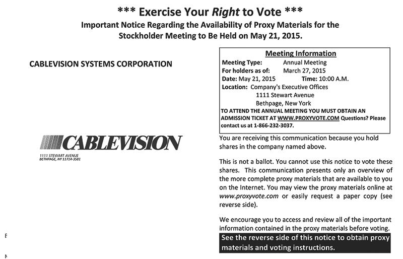 Important Notice: Our 2014 Annual Report on Form 10-K and the 2015 Proxy Statement are available at www.cablevision.com/investor/proxy.jsp