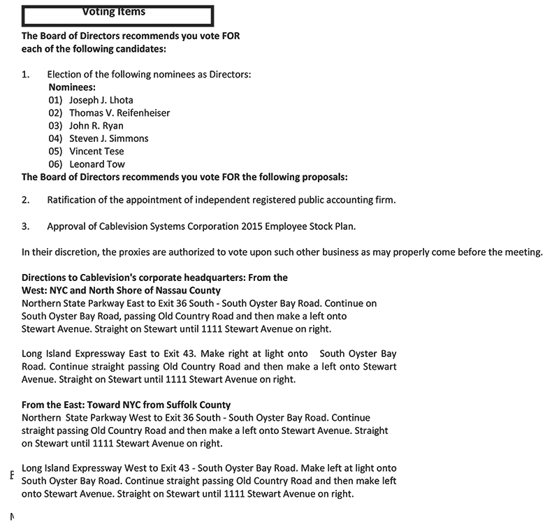Voting Items The Board of Directors recommends you vote FOR each of the following candidates: 1. Election of the following nominees as Directors: Nominees: 01) Joseph J. Lhota 02) Thomas V. Reifenheiser 03) John R. Ryan 04) Steven J. Simmons 05) Vincent Tese 06) Leonard Tow The Board of Directors recommends you vote FOR the following proposals: 2. Ratification of the appointment of independent registered public accounting firm. 3. Approval of Cablevision Systems Corporation 2015 Employee Stock Plan. In their discretion, the proxies are authorized to vote upon such other business as may properly come before the meeting. Directions to Cablevision’s corporate headquarters: From the West: NYC and North Shore of Nassau County Northern State Parkway East to Exit 36 South - South Oyster Bay Road. Continue on South Oyster Bay Road, passing Old Country Road and then make a left onto Stewart Avenue. Straight on Stewart until 1111 Stewart Avenue on right. Long Island Expressway East to Exit 43. Make right at light onto South Oyster Bay Road. Continue straight passing Old Country Road and then make a left onto Stewart Avenue. Straight on Stewart until 1111 Stewart Avenue on right. From the East: Toward NYC from Suffolk County Northern State Parkway West to Exit 36 South - South Oyster Bay Road. Continue straight passing Old Country Road and then make a left onto Stewart Avenue. Straight on Stewart until 1111 Stewart Avenue on right. Long Island Expressway West to Exit 43 - South Oyster Bay Road. Make left at light onto South Oyster Bay Road. Continue straight passing Old Country Road and then make left onto Stewart Avenue. Straight on Stewart until 1111 Stewart Avenue on right.