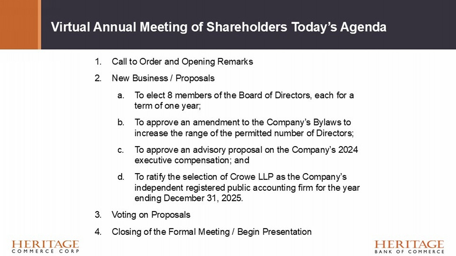 Virtual Annual Meeting of Shareholders Today’s Agenda 1. Call to Order and Opening Remarks 2. New Business / Proposals a. To elect 8 members of the Board of Directors, each for a term of one year; b. To approve an amendment to the Company’s Bylaws to increase the range of the permitted number of Directors; c. To approve an advisory proposal on the Company’s 2024 executive compensation; and d. To ratify the selection of Crowe LLP as the Company’s independent registered public accounting firm for the year ending December 31, 2025. 3. Voting on Proposals 4. Closing of the Formal Meeting / Begin Presentation