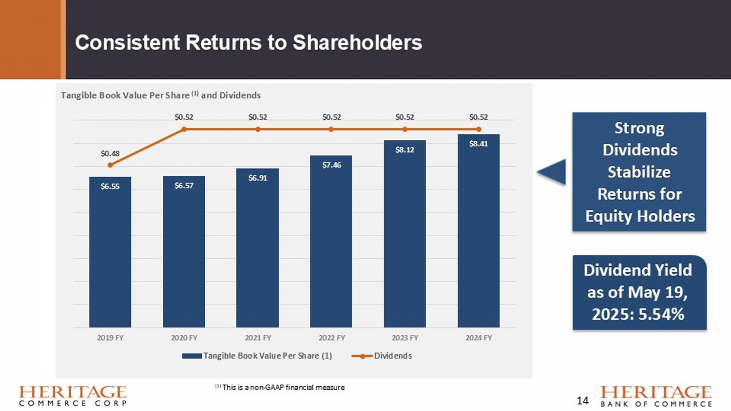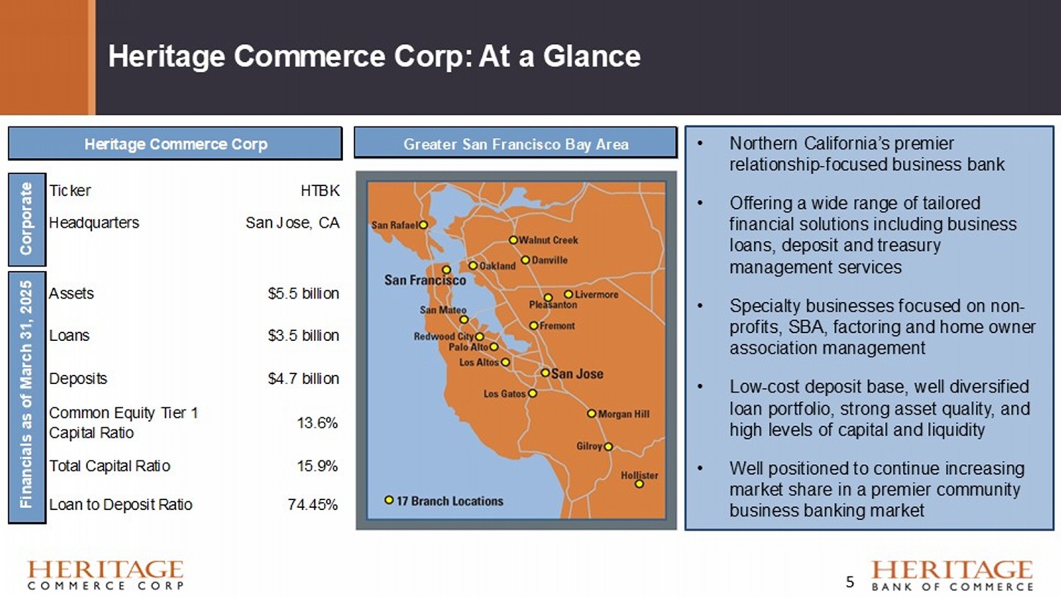 Forward Looking Statement Disclaimer and Basis of Presentation • Forward - looking statements are based on management’s knowledge and belief as of today and include information concerning Heritage Commerce Corp, the holding company (the “Company”) for Heritage Bank of Commerce (the “Bank”), possible or assumed future financial condition, and its results of operations, business and earnings outlook. These forward - looking statements are subject to risks and uncertainties. For a discussion of risk factors which could cause results to differ, please see the Company’s reports on Forms 10 - K and 10 - Q as filed with the Securities and Exchange Commission and the Company’s press releases. Readers should not place undue reliance on the forward - looking statements, which reflect management's view only as of the date hereof. The Company undertakes no obligation to publicly revise these forward - looking statements to reflect subsequent events or circumstances. • Financial results are presented in accordance with accounting principles generally accepted in the United States of America (“GAAP”) and with reference to certain non - GAAP financial measures. However, certain non - GAAP performance measures and ratios are used by management to evaluate and measure the Company’s performance. The Company believes these non - GAAP financial measures are common in the banking industry, and may enhance comparability for peer comparison purposes. These non - GAAP financial measures should be supplemental to primary GAAP financial measures and should not be read in isolation or relied upon as a substitute for primary GAAP financial measures. A reconciliation of GAAP to non - GAAP financial measures are presented in the Company’s reports on Forms 10 - K and 10 - Q as filed with the Securities and Exchange Commission and the Company’s press releases. 4
