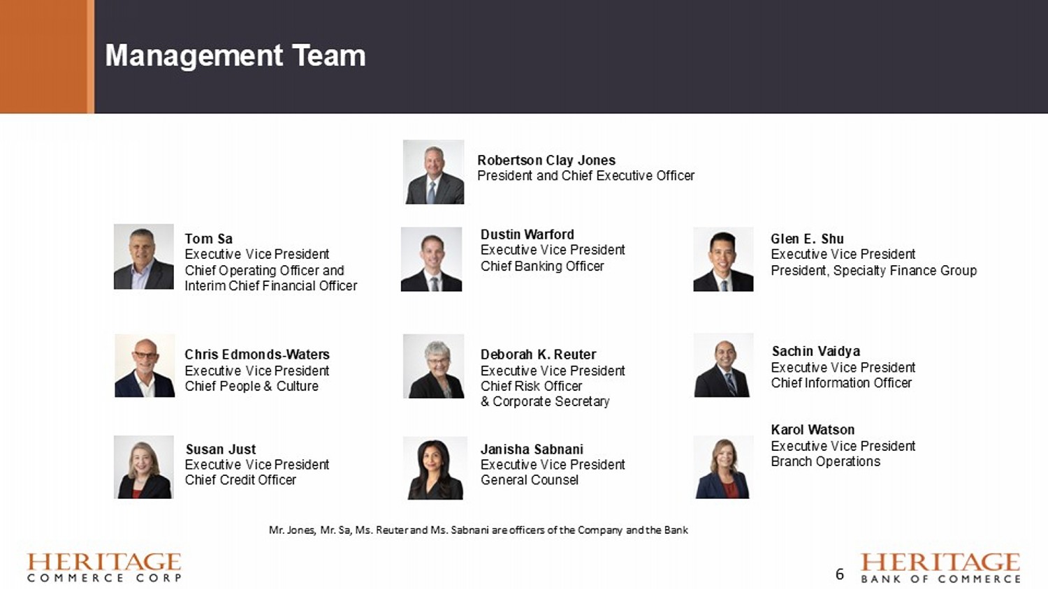 Management Team Robertson Clay Jones President and Chief Executive Officer Chris Edmonds - Waters Executive Vice President Chief People & Culture Susan Just Executive Vice President Chief Credit Officer Deborah K. Reuter Executive Vice President Chief Risk Officer & Corporate Secretary Janisha Sabnani Executive Vice President General Counsel Sachin Vaidya Executive Vice President Chief Information Officer Karol Watson Executive Vice President Branch Operations Tom Sa Executive Vice President Chief Operating Officer and Interim Chief Financial Officer Glen E. Shu Executive Vice President President, Specialty Finance Group Dustin Warford Executive Vice President Chief Banking Officer Mr . Jones, Mr . Sa, Ms . Reuter and Ms . Sabnani are officers of the Company and the Bank 6