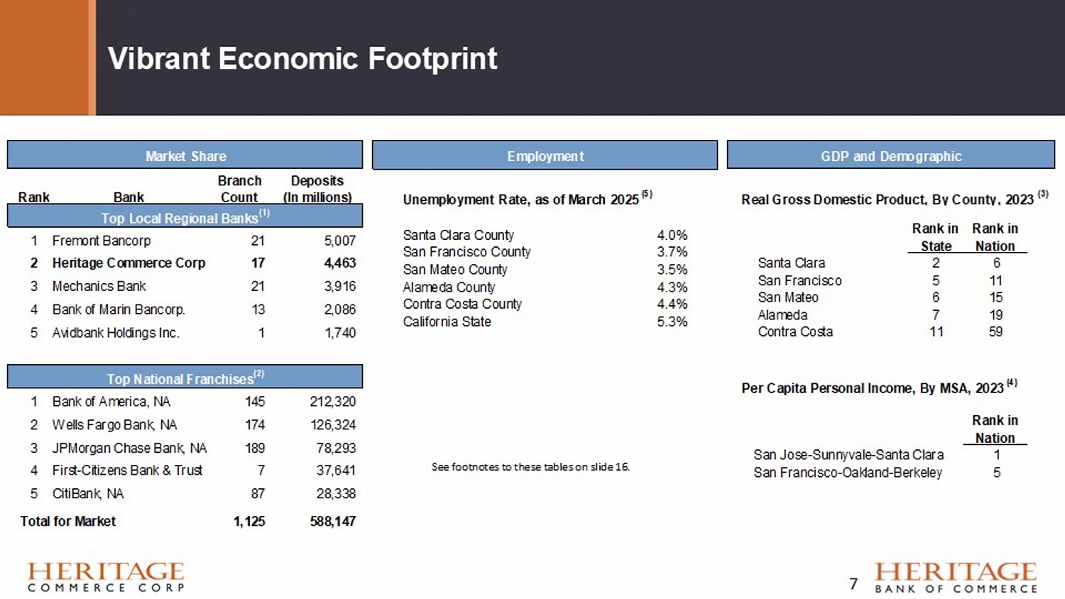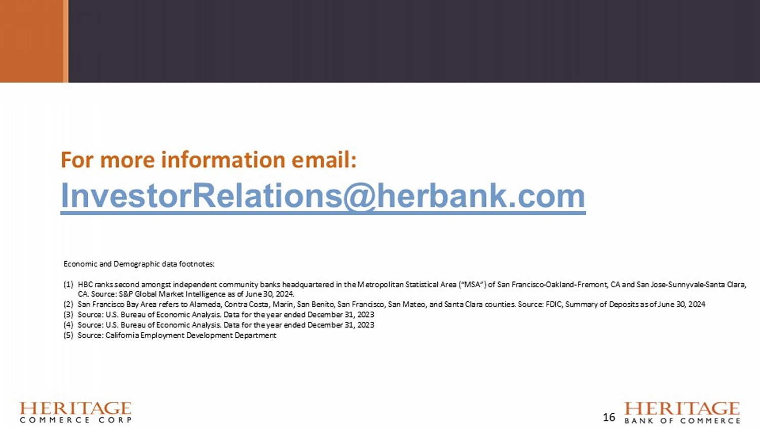 For more information email: InvestorRelations@herbank.com Economic and Demographic data footnotes: (1) HBC ranks second amongst inde pendent community banks headquartered in t he Metropolitan Statistical Area (“MSA”) of San Francisco - Oakland - Fremont, CA and San J ose - Sunnyvale - Santa Clara, CA. Source: S&P Global Market Intelligence as of June 30, 2024. (2) San Francisco Bay Area refers to Alameda, Contra Costa, Marin, San Benito, San Francisco, San Mateo, and Santa Clara counties . S ource: FDIC, Summary of Deposits as of June 30, 20 24 (3) Source: U.S. Bureau of Economic Analysis. Data for the year ended December 31, 2023 (4) Source: U.S. Bureau of Economic Analysis. Data for the year ended December 31, 2023 (5) Source: California Employment Development Department 16