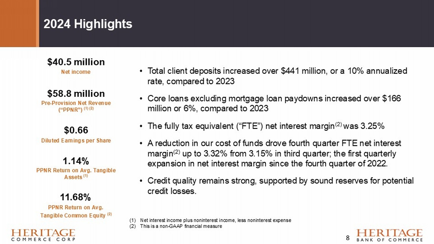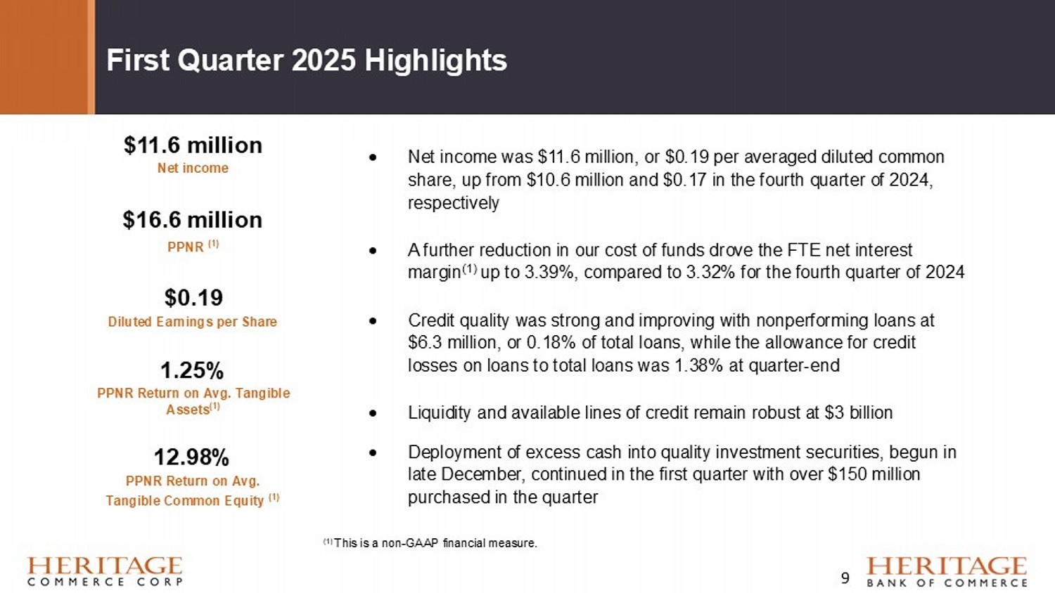 First Quarter 2025 Highlights Net income was $11.6 million, or $0.19 per averaged diluted common share, up from $10.6 million and $0.17 in the fourth quarter of 2024, respectively A further reduction in our cost of funds drove the FTE net interest margin (1) up to 3.39%, compared to 3.32% for the fourth quarter of 2024 Credit quality was strong and improving with nonperforming loans at $6.3 million, or 0.18% of total loans, while the allowance for credit losses on loans to total loans was 1.38% at quarter - end Liquidity and available lines of credit remain robust at $3 billion Deployment of excess cash into quality investment securities, begun in late December, continued in the first quarter with over $150 million purchased in the quarter (1) This is a non - GAAP financial measure. $11.6 million Net income $16.6 million PPNR (1) $0.19 Diluted Earnings per Share 1.25% PPNR Return on Avg. Tangible Assets (1) 12.98% PPNR Return on Avg. Tangible Common Equity (1) 9