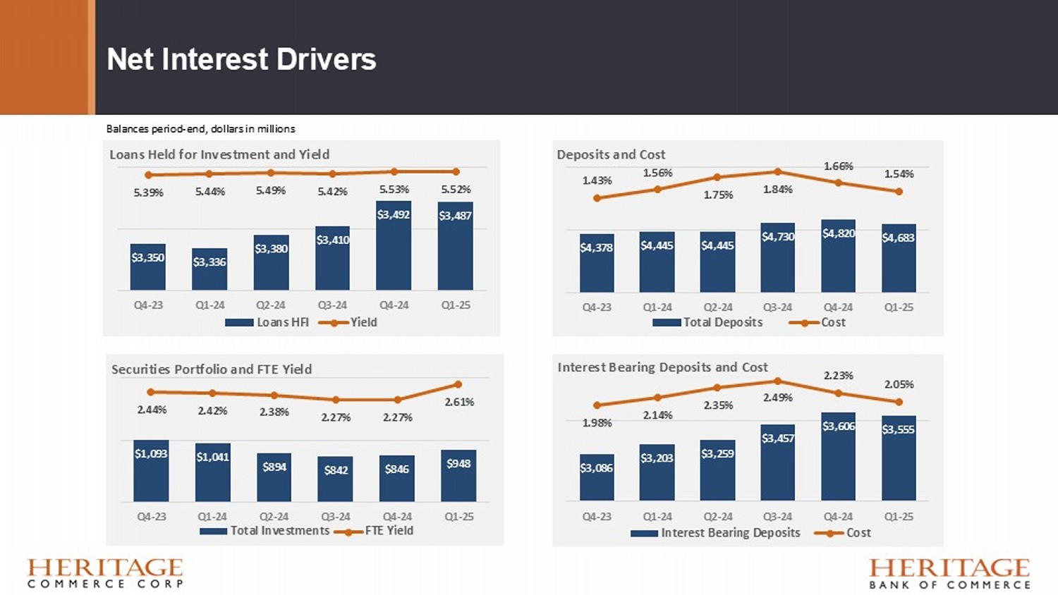 Net Interest Drivers $3,350 $3,336 $3,380 $3,410 $3,492 $3,487 5.39% 5.44% 5.49% 5.42% 5.53% 5.52% Q4-23 Q1-24 Q2-24 Q3-24 Q4-24 Q1-25 Loans Held for Investment and Yield Loans HFI Yield $1,093 $1,041 $894 $842 $846 $948 2.44% 2.42% 2.38% 2.27% 2.27% 2.61% Q4-23 Q1-24 Q2-24 Q3-24 Q4-24 Q1-25 Securities Portfolio and FTE Yield Total Investments FTE Yield $4,378 $4,445 $4,445 $4,730 $4,820 $4,683 1.43% 1.56% 1.75% 1.84% 1.66% 1.54% Q4-23 Q1-24 Q2-24 Q3-24 Q4-24 Q1-25 Deposits and Cost Total Deposits Cost $3,086 $3,203 $3,259 $3,457 $3,606 $3,555 1.98% 2.14% 2.35% 2.49% 2.23% 2.05% Q4-23 Q1-24 Q2-24 Q3-24 Q4-24 Q1-25 Interest Bearing Deposits and Cost Interest Bearing Deposits Cost Balances period - end, dollars in millions