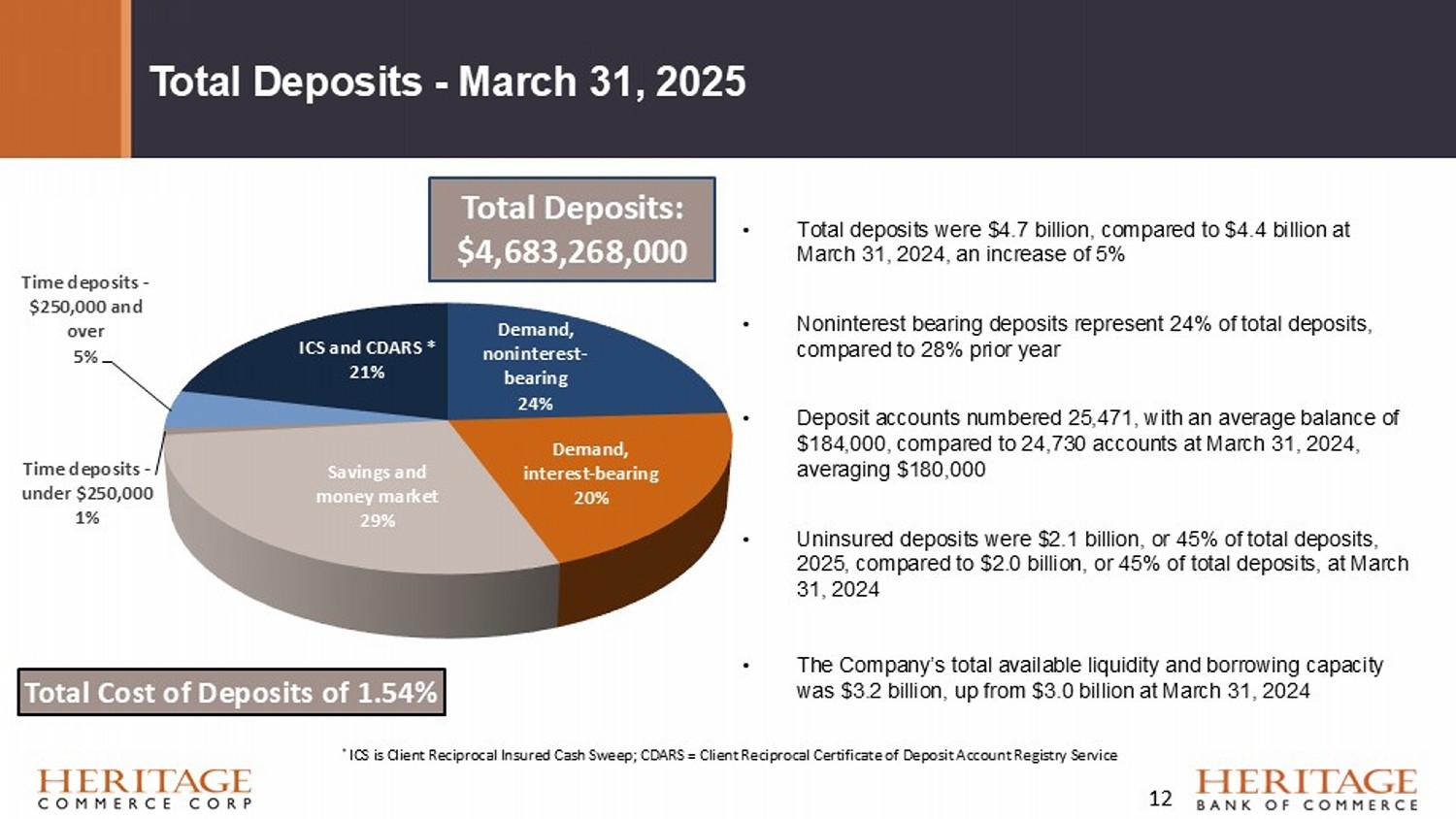 Diversified Loan Portfolio - March 31, 2025 Industrial , 23% (9% of loans) Retail , 30% (12% of Loans) Office , 24% (9% of loans) Mixed - Use, Special Purpose , 22% (9% of loans) Non - Owner Commercial Real Estate (“CRE”) Loans $1.4 Billion $489 M Commercial 14% $1,363 M CRE Non - Owner Occupied 39% $617 M CRE Owner Occupied 18% $136 M Land & Construction 4% $869 M Residential RE 25% $13 M Consumer and other < 1% $3.5 Billion The Bank’s Loan to Deposit Ratio was 74.5% at March 31, 2025, compared to 75.1% a year ago 11