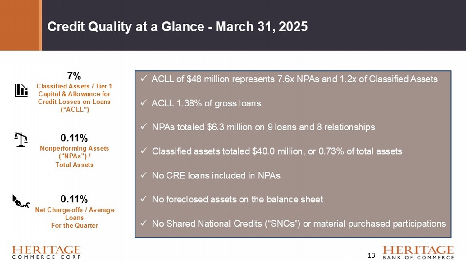 Credit Quality at a Glance - March 31, 2025 x ACLL of $48 million represents 7.6x NPAs and 1.2x of Classified Assets x ACLL 1.38% of gross loans x NPAs totaled $6.3 million on 9 loans and 8 relationships x Classified assets totaled $40.0 million, or 0.73% of total assets x No CRE loans included in NPAs x No foreclosed assets on the balance sheet x No Shared National Credits (“SNCs”) or material purchased participations 7% Classified Assets / Tier 1 Capital & Allowance for Credit Losses on Loans (“ACLL”) 0.11% Nonperforming Assets ("NPAs") / Total Assets 0.11% Net Charge - offs / Average Loans For the Quarter 13