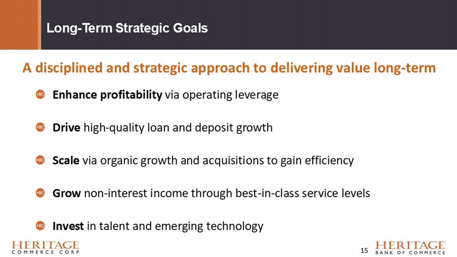 Long - Term Strategic Goals Enhance profitability via operating leverage Drive high - quality loan and deposit growth Scale via organic growth and acquisitions to gain efficiency Grow non - interest income through best - in - class service levels Invest in talent and emerging technology A disciplined and strategic approach to delivering value long - term 15