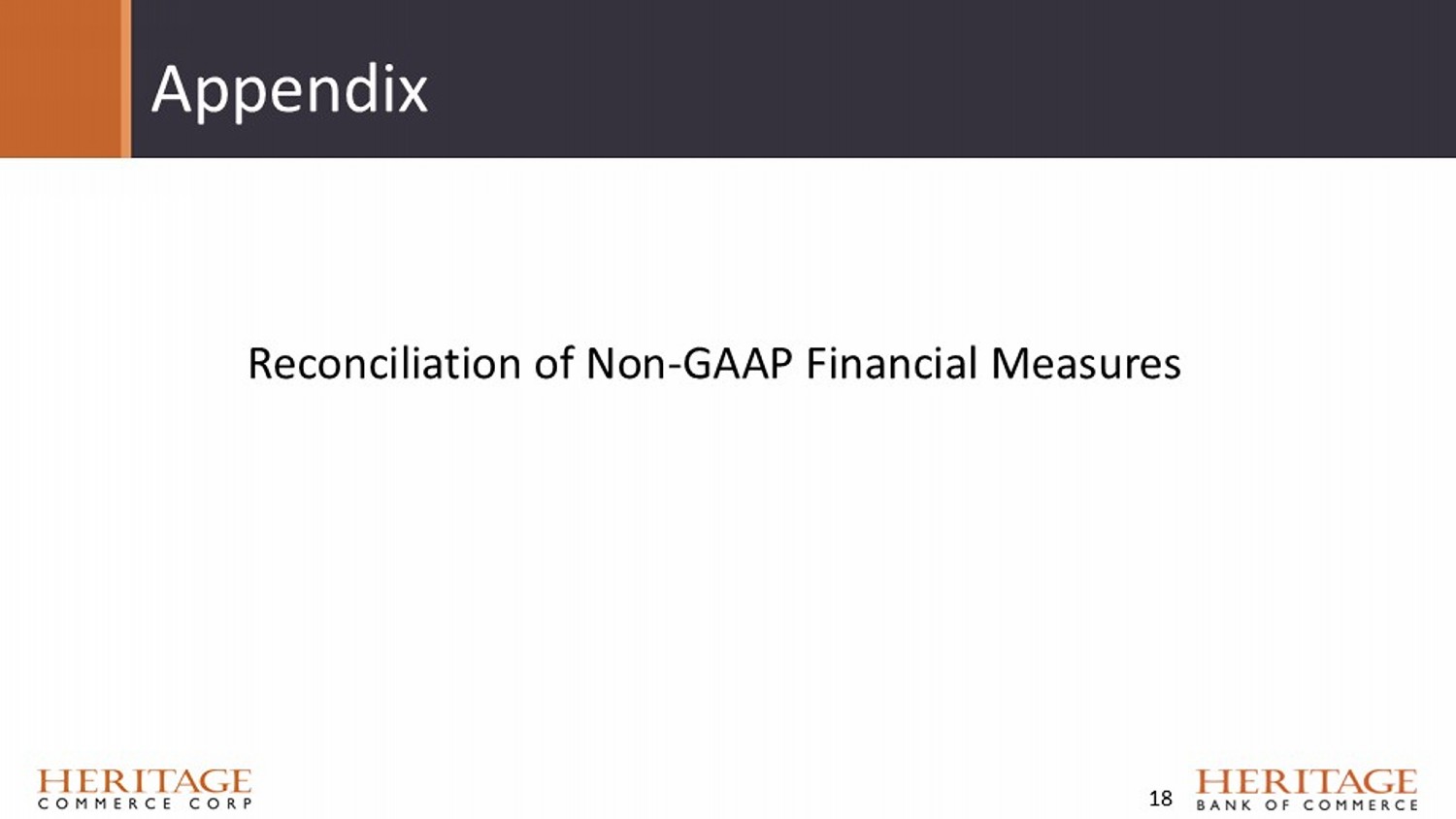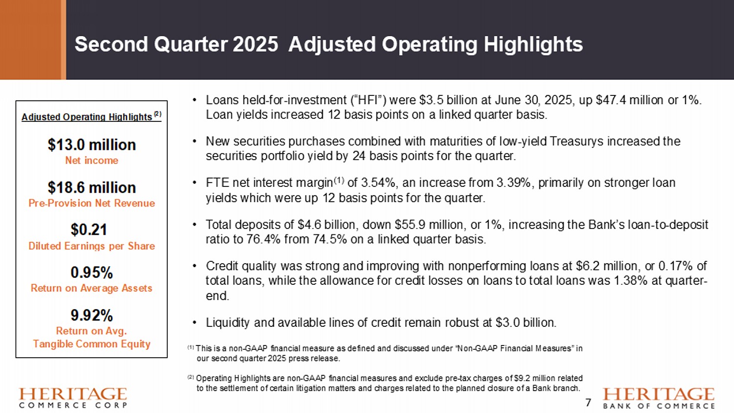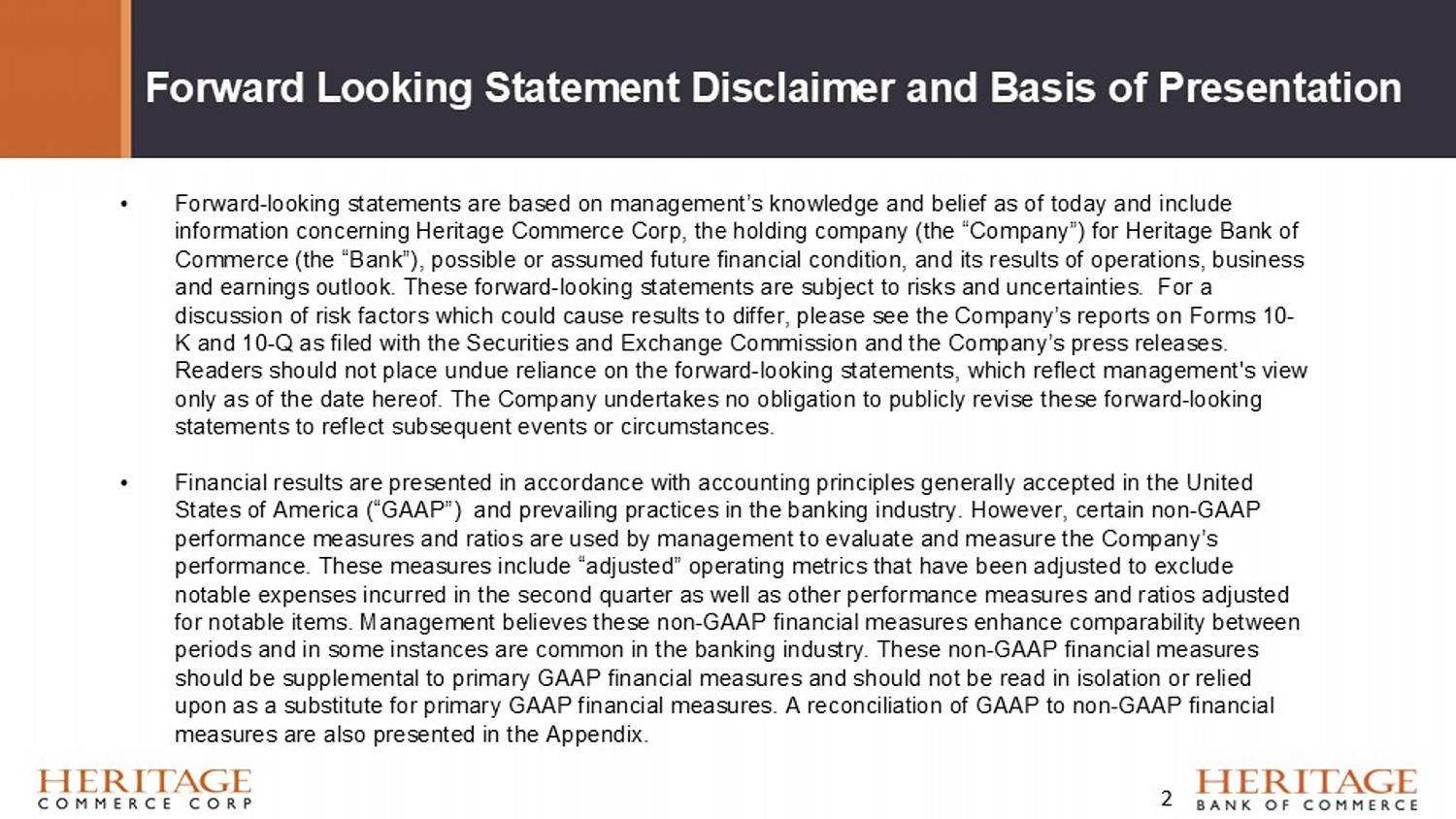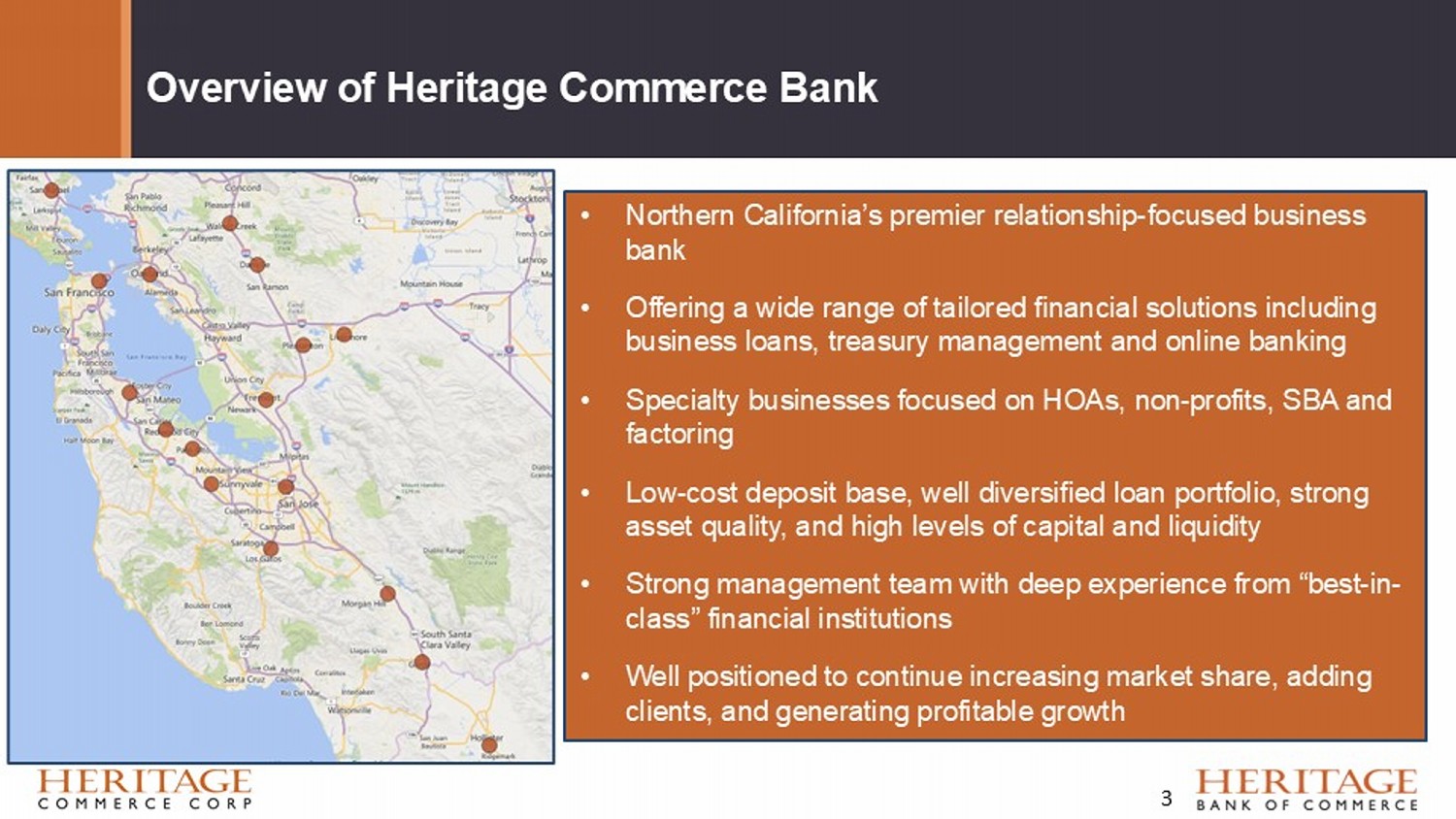 Forward Looking Statement Disclaimer and Basis of Presentation • Forward - looking statements are based on management’s knowledge and belief as of today and include information concerning Heritage Commerce Corp, the holding company (the “Company”) for Heritage Bank of Commerce (the “Bank”), possible or assumed future financial condition, and its results of operations, business and earnings outlook. These forward - looking statements are subject to risks and uncertainties. For a discussion of risk factors which could cause results to differ, please see the Company’s reports on Forms 10 - K and 10 - Q as filed with the Securities and Exchange Commission and the Company’s press releases. Readers should not place undue reliance on the forward - looking statements, which reflect management's view only as of the date hereof. The Company undertakes no obligation to publicly revise these forward - looking statements to reflect subsequent events or circumstances. • Financial results are presented in accordance with accounting principles generally accepted in the United States of America (“GAAP”) and prevailing practices in the banking industry. However, certain non - GAAP performance measures and ratios are used by management to evaluate and measure the Company’s performance. These measures include “adjusted” operating metrics that have been adjusted to exclude notable expenses incurred in the second quarter as well as other performance measures and ratios adjusted for notable items. Management believes these non - GAAP financial measures enhance comparability between periods and in some instances are common in the banking industry. These non - GAAP financial measures should be supplemental to primary GAAP financial measures and should not be read in isolation or relied upon as a substitute for primary GAAP financial measures. A reconciliation of GAAP to non - GAAP financial measures are also presented in the Appendix. 2