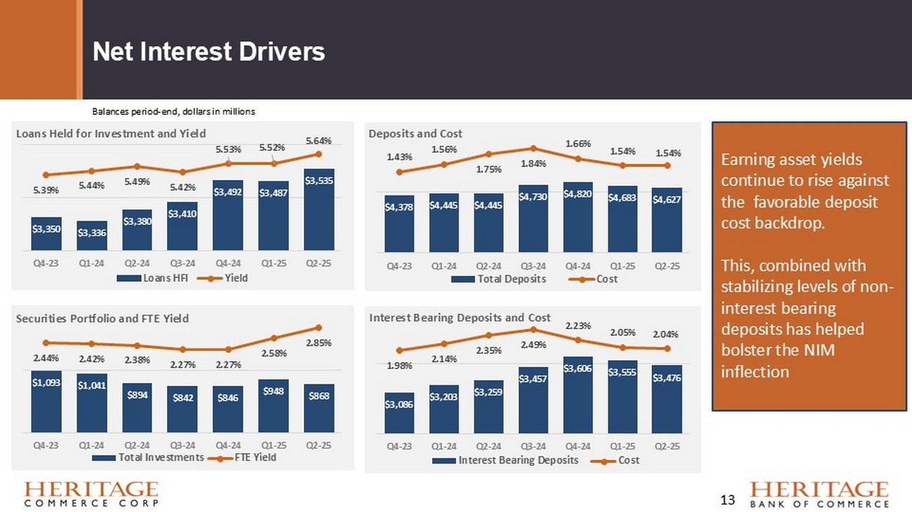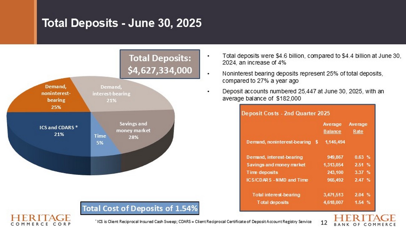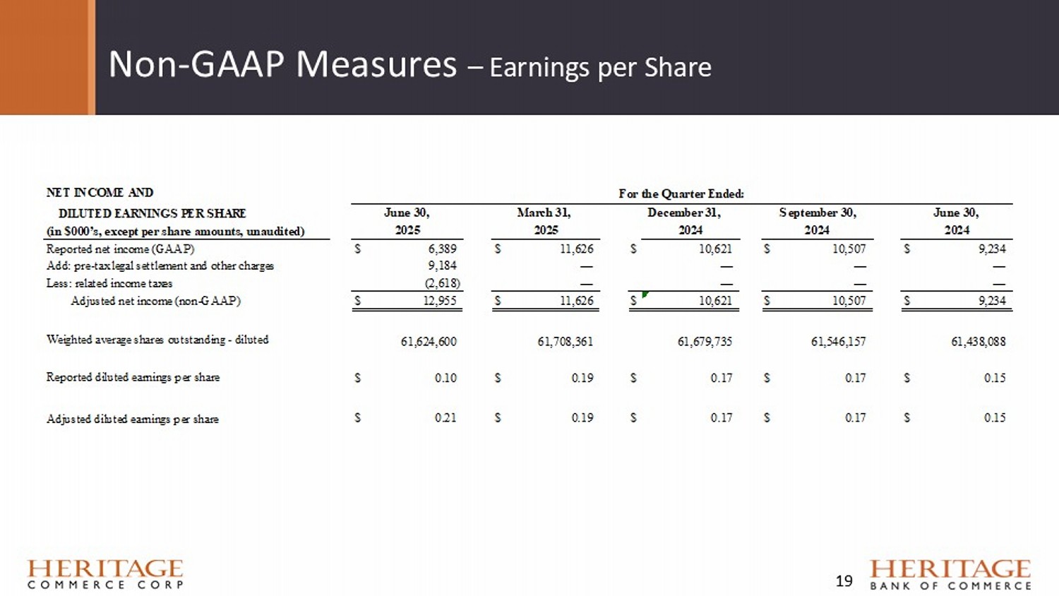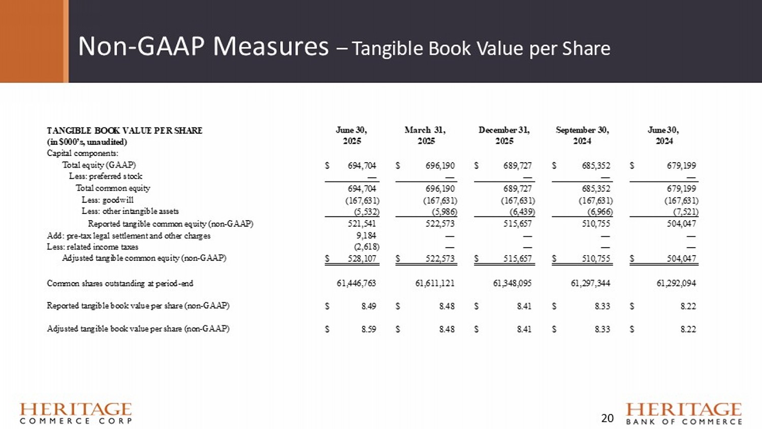 Forward Looking Statement Disclaimer and Basis of Presentation • Forward - looking statements are based on management’s knowledge and belief as of today and include information concerning Heritage Commerce Corp, the holding company (the “Company”) for Heritage Bank of Commerce (the “Bank”), possible or assumed future financial condition, and its results of operations, business and earnings outlook. These forward - looking statements are subject to risks and uncertainties. For a discussion of risk factors which could cause results to differ, please see the Company’s reports on Forms 10 - K and 10 - Q as filed with the Securities and Exchange Commission and the Company’s press releases. Readers should not place undue reliance on the forward - looking statements, which reflect management's view only as of the date hereof. The Company undertakes no obligation to publicly revise these forward - looking statements to reflect subsequent events or circumstances. • Financial results are presented in accordance with accounting principles generally accepted in the United States of America (“GAAP”) and prevailing practices in the banking industry. However, certain non - GAAP performance measures and ratios are used by management to evaluate and measure the Company’s performance. These measures include “adjusted” operating metrics that have been adjusted to exclude notable expenses incurred in the second quarter as well as other performance measures and ratios adjusted for notable items. Management believes these non - GAAP financial measures enhance comparability between periods and in some instances are common in the banking industry. These non - GAAP financial measures should be supplemental to primary GAAP financial measures and should not be read in isolation or relied upon as a substitute for primary GAAP financial measures. A reconciliation of GAAP to non - GAAP financial measures are also presented in the Appendix. 2