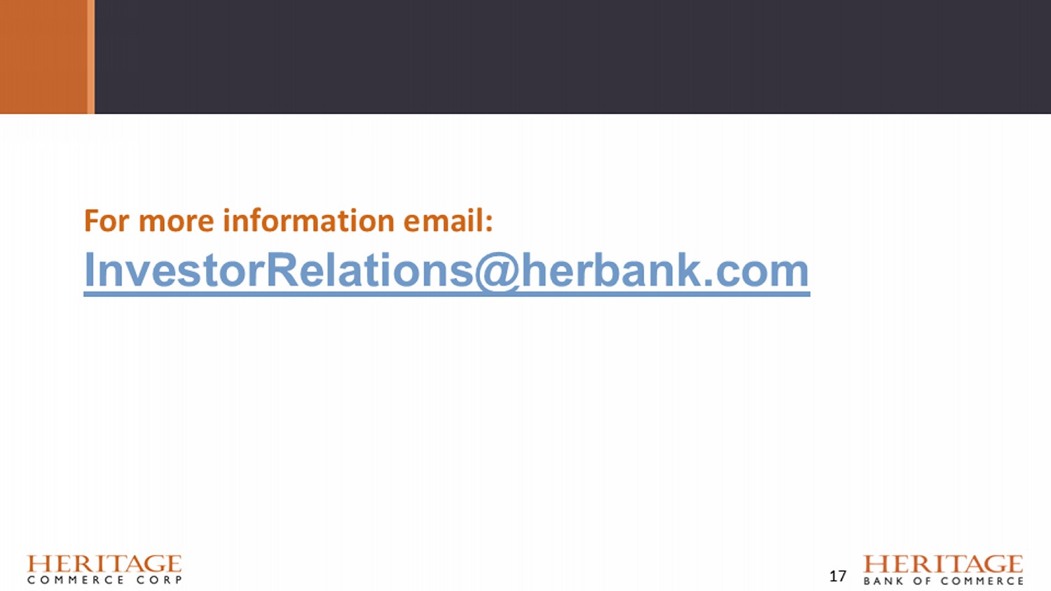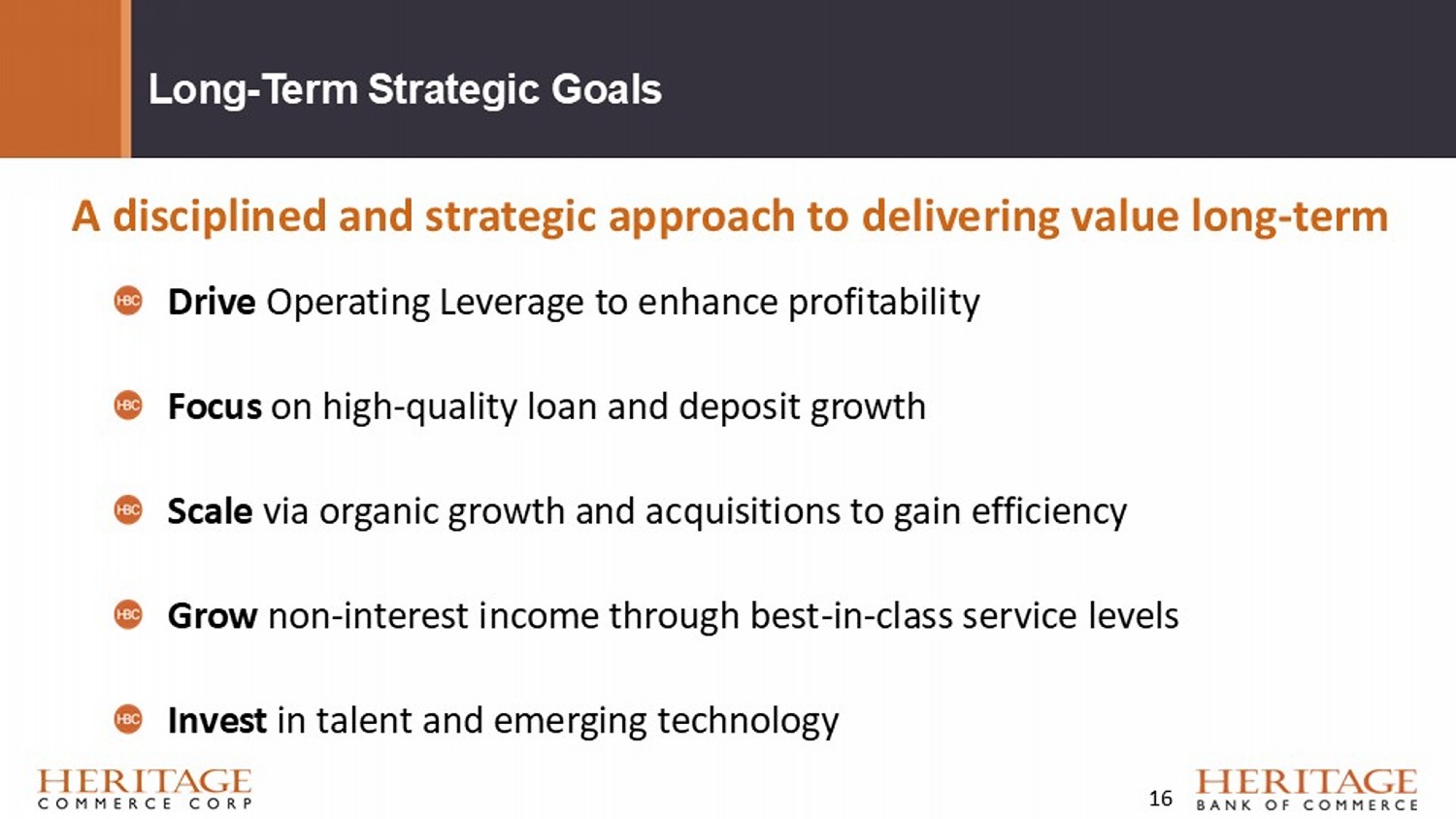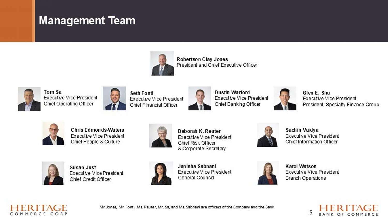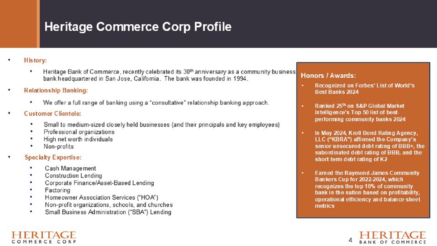 Heritage Commerce Corp Profile History: Heritage Bank of Commerce, recently celebrated its 30th anniversary as a community business bank headquartered in San Jose, California. The bank was founded in 1994. Relationship Banking: We offer a full range of banking using a consultative relationship banking approach. Customer Clientele: Small to medium-sized closely held businesses (and their principals and key employees) Professional organizations High net worth individuals Non-profits Specialty Expertise: Cash Management Construction Lending Corporate Finance/Asset-Based Lending Factoring Homeowner Association Services (HOA) Non-profit organizations, schools, and churches Small Business Administration (SBA) Lending Honors / Awards: Recognized on Forbes List of Worlds Best Banks 2024 Ranked 25th on SP Global Market Intelligences Top 50 list of bestperforming community banks 2024 In May 2024, Kroll Bond Rating Agency, LLC (KBRA) affirmed the Companys senior unsecured debt rating of BBB+, the subordinated debt rating of BBB, and the short-term debt rating of K2 Earned the Raymond James Community Bankers Cup for 2022-2024, which recognizes the top 10% of community bank in the nation based on profitability, operational efficiency and balance sheet metrics 4