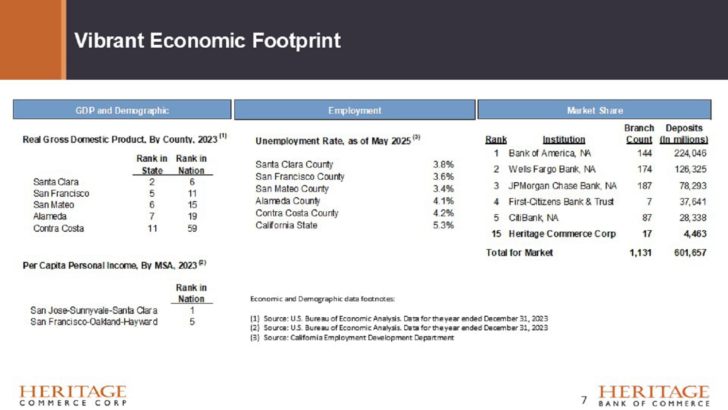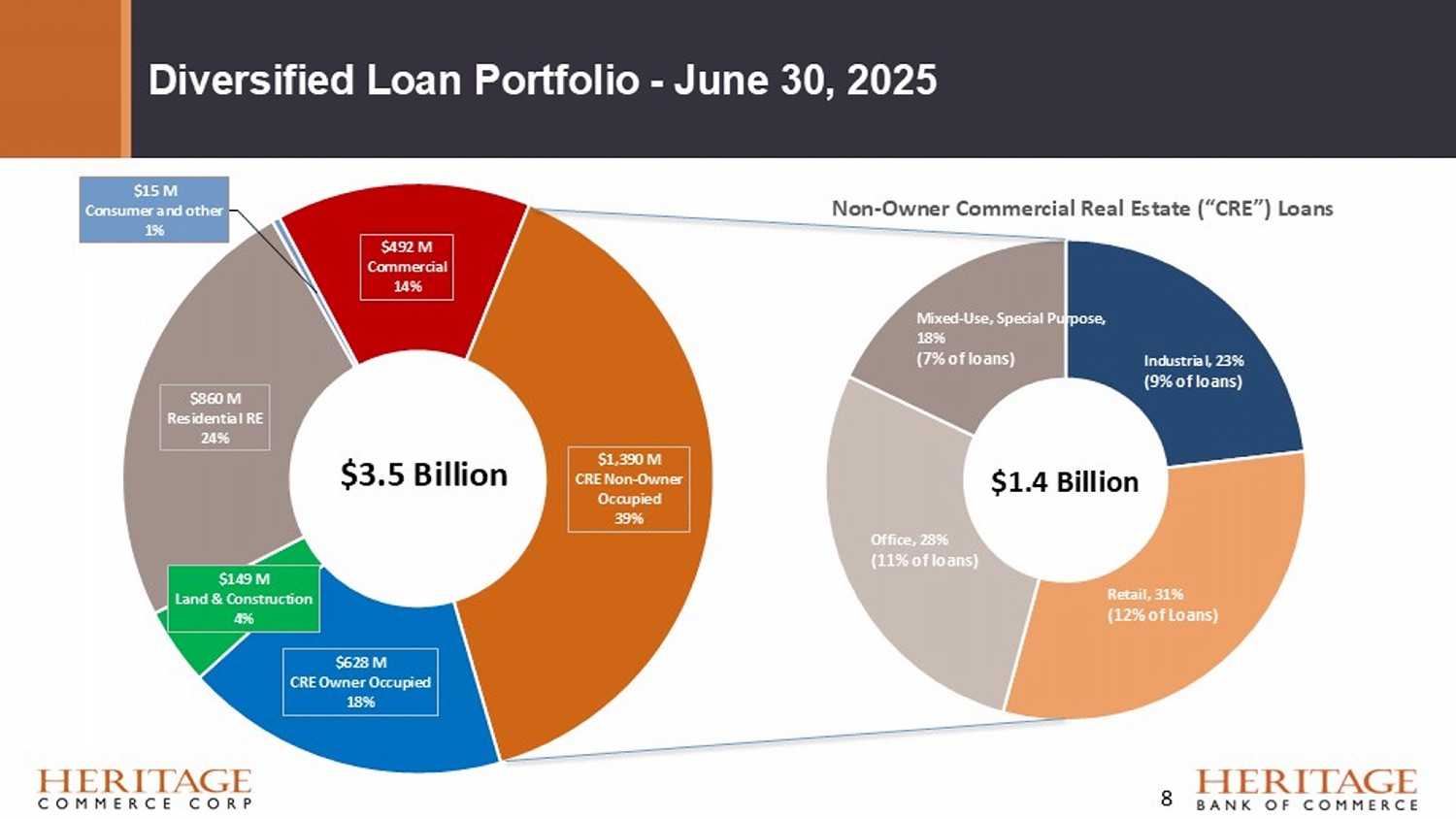 Vibrant Economic Footprint 7 Market Share Branch Deposits Rank Institution Count (In millions) 1 Bank of America, NA 144 224,046 2 Wells Fargo Bank, NA 174 126,325 3 JPMorgan Chase Bank, NA 187 78,293 4 First-Citizens Bank & Trust 7 37,641 5 CitiBank, NA 87 28,338 15 Heritage Commerce Corp 17 4,463 Total for Market 1,131 601,657 Economic and Demographic data footnotes: (1) Source: U.S. Bureau of Economic Analysis. Data for the year ended December 31, 2023 (2) Source: U.S. Bureau of Economic Analysis. Data for the year ended December 31, 2023 (3) Source: California Employment Development Department GDP and Demographic Real Gross Domestic Product, By County, 2023 (1) Rank in State Rank in Nation Santa Clara 2 6 San Francisco 5 11 San Mateo 6 15 Alameda 7 19 Contra Costa 11 59 Per Capita Personal Income, By MSA, 2023 (2) Rank in Nation San Jose-Sunnyvale-Santa Clara 1 San Francisco-Oakland-Hayward 5 Employment Unemployment Rate, as of May 2025 (3) Santa Clara County 3.8% San Francisco County 3.6% San Mateo County 3.4% Alameda County 4.1% Contra Costa County 4.2% California State 5.3%