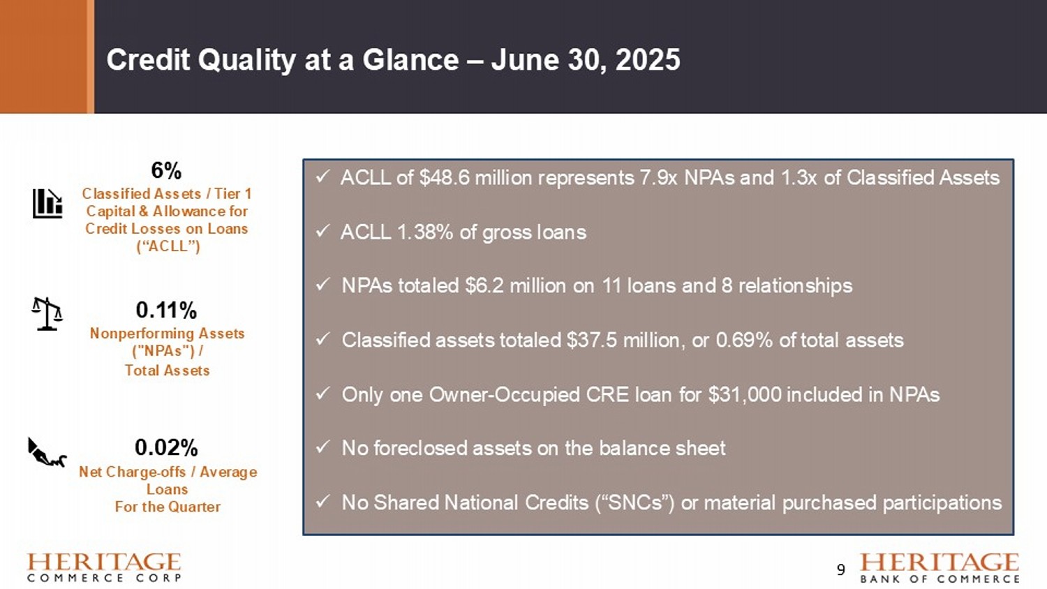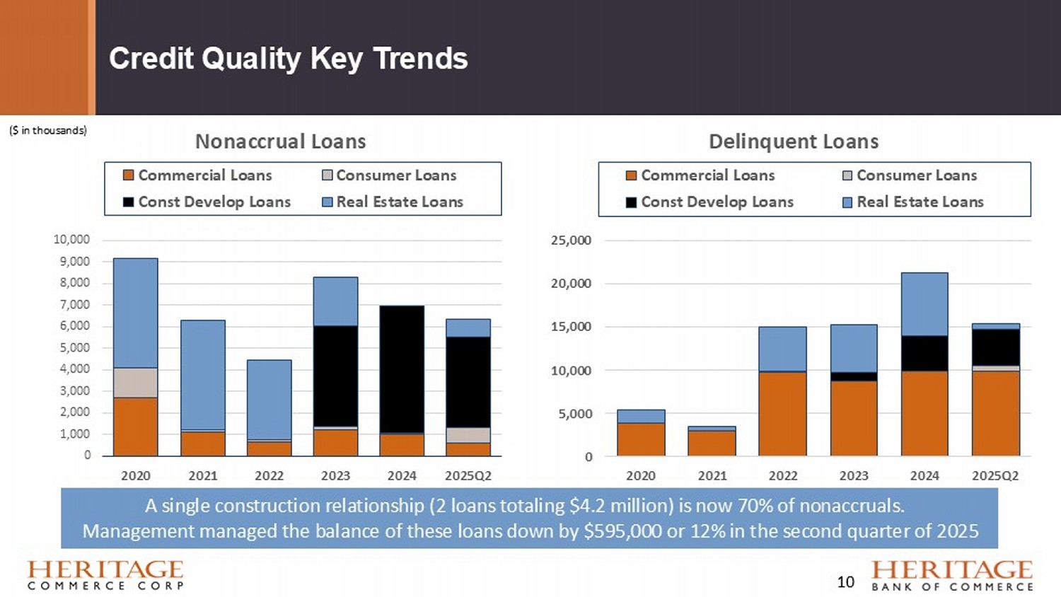 Credit Quality at a Glance – June 30, 2025 x ACLL of $48.6 million represents 7.9x NPAs and 1.3x of Classified Assets x ACLL 1.38% of gross loans x NPAs totaled $6.2 million on 11 loans and 8 relationships x Classified assets totaled $37.5 million, or 0.69% of total assets x Only one Owner - Occupied CRE loan for $31,000 included in NPAs x No foreclosed assets on the balance sheet x No Shared National Credits (“SNCs”) or material purchased participations 6% Classified Assets / Tier 1 Capital & Allowance for Credit Losses on Loans (“ACLL”) 0.11% Nonperforming Assets ("NPAs") / Total Assets 0.02% Net Charge - offs / Average Loans For the Quarter 9