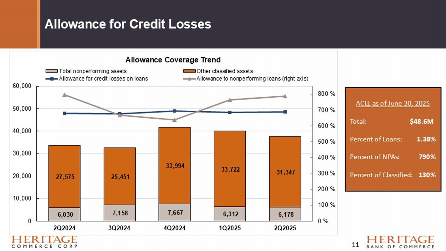 Credit Quality Key Trends ($ in thousands) 10 0 5,000 10,000 15,000 20,000 25,000 2020 2021 2022 2023 2024 2025Q2 Delinquent Loans Commercial Loans Consumer Loans Const Develop Loans Real Estate Loans 0 1,000 2,000 3,000 4,000 5,000 6,000 7,000 8,000 9,000 10,000 2020 2021 2022 2023 2024 2025Q2 Nonaccrual Loans Commercial Loans Consumer Loans Const Develop Loans Real Estate Loans A single construction relationship (2 loans totaling $4.2 million) is now 70% of nonaccruals. Management managed the balance of these loans down by $595,000 or 12% in the second quarter of 2025