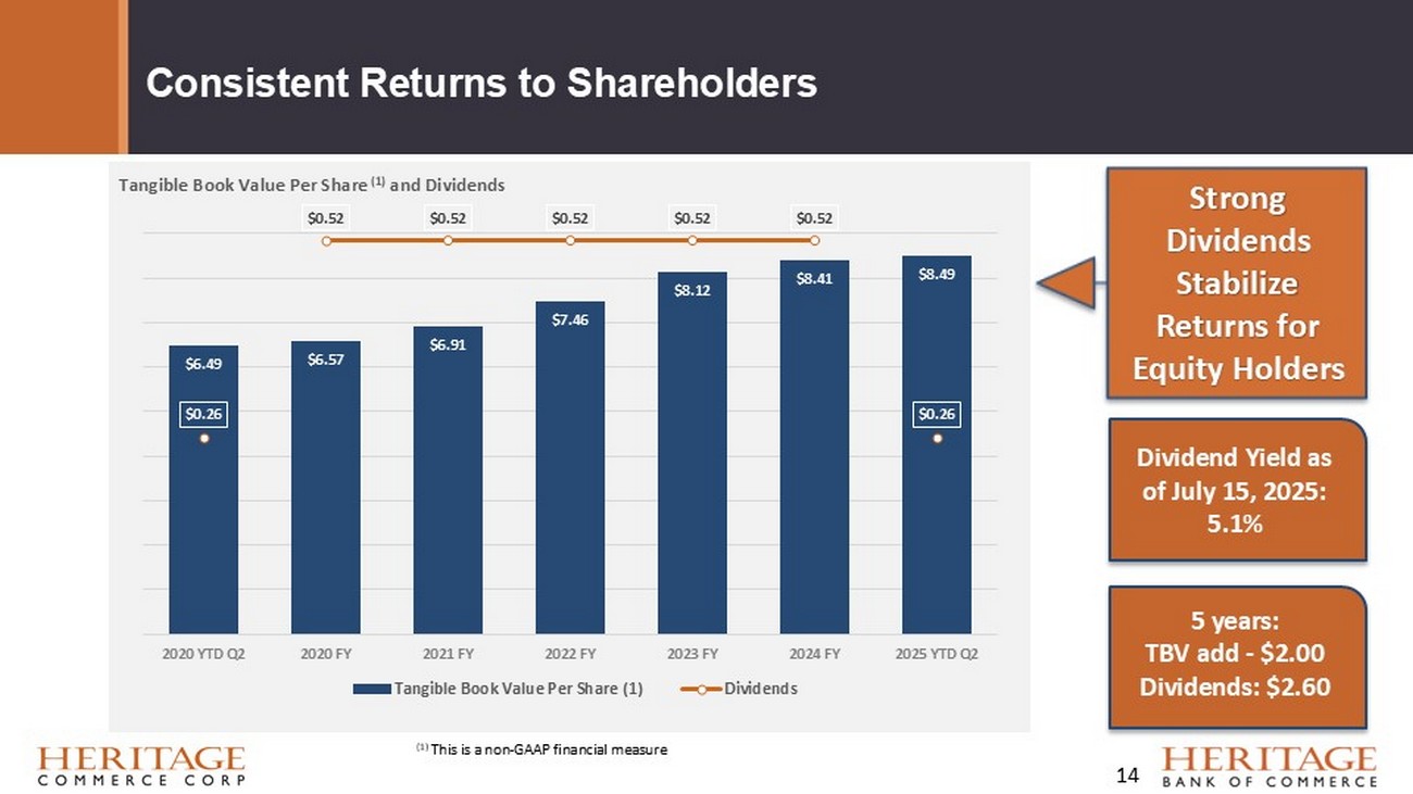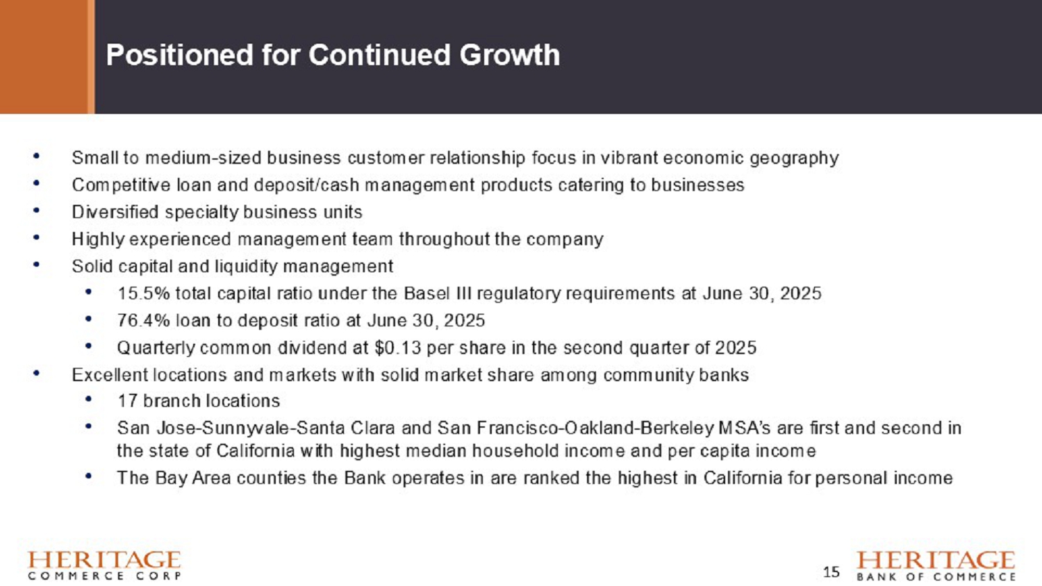 Positioned for Continued Growth • Small to medium-sized business customer relationship focus in vibrant economic geography • Competitive loan and deposit/cash management products catering to businesses • Diversified specialty business units • Highly experienced management team throughout the company • Solid capital and liquidity management • 15.5% total capital ratio under the Basel III regulatory requirements at June 30, 2025 • 76.4% loan to deposit ratio at June 30, 2025 • Quarterly common dividend at $0.13 per share in the second quarter of 2025 • Excellent locations and markets with solid market share among community banks • 17 branch locations • San Jose-Sunnyvale-Santa Clara and San Francisco-Oakland-Berkeley MSA’s are first and second in the state of California with highest median household income and per capita income • The Bay Area counties the Bank operates in are ranked the highest in California for personal income 15
