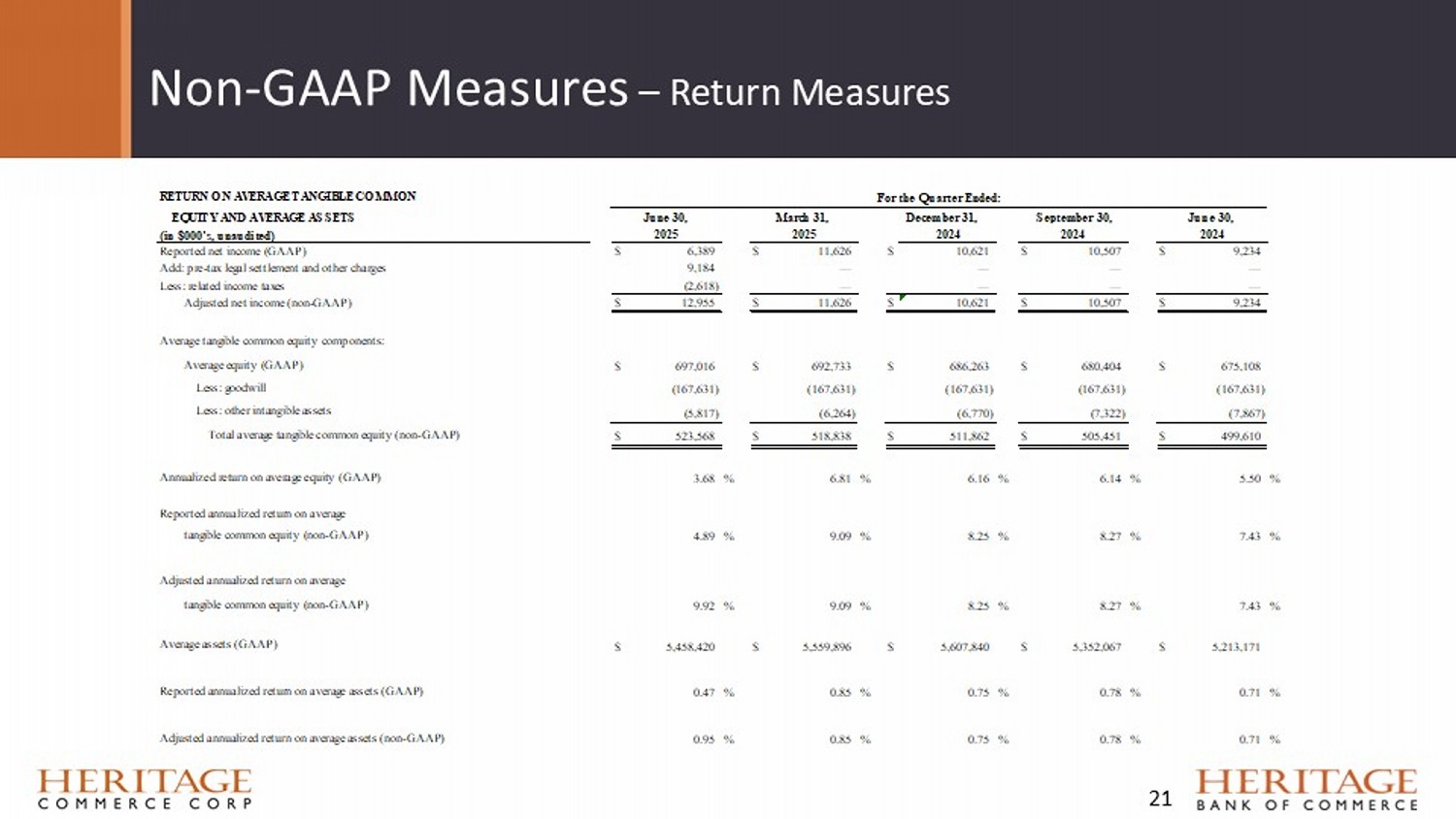 Non - GAAP Measures – Tangible Book Value per Share 20 TANGIBLE BOOK VALUE PER SHARE June 30, March 31, December 31, September 30, June 30, (in $000’s, unaudited) 2025 2025 2025 2024 2024 Capital components: Total equity (GAAP) $ 694,704 $ 696,190 $ 689,727 $ 685,352 $ 679,199 Less: preferred stock — — — — — Total common equity 694,704 696,190 689,727 685,352 679,199 Less: goodwill (167,631) (167,631) (167,631) (167,631) (167,631) Less: other intangible assets (5,532) (5,986) (6,439) (6,966) (7,521) Reported tangible common equity (non -GAAP) 521,541 522,573 515,657 510,755 504,047 Add: pre-tax legal settlement and other charges 9,184 — — — — Less: related income taxes (2,618) — — — — Adjusted tangible common equity (non -GAAP) $ 528,107 $ 522,573 $ 515,657 $ 510,755 $ 504,047 Common shares outstanding at period -end 61,446,763 61,611,121 61,348,095 61,297,344 61,292,094 Reported tangible book value per share (non -GAAP) $ 8.49 $ 8.48 $ 8.41 $ 8.33 $ 8.22 Adjusted tangible book value per share (non -GAAP) $ 8.59 $ 8.48 $ 8.41 $ 8.33 $ 8.22