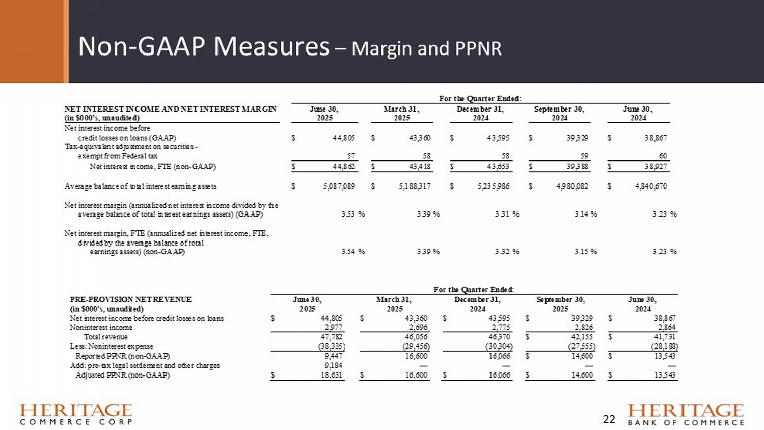 Non - GAAP Measures – Return Measures 21 RETURN ON AVERAGE TANGIBLE COMMON EQUITY AND AVERAGE ASSETS (in $000’s, unaudited) 2024 Reported net income (GAAP) $ 6,389 $ 11,626 $ 10,621 $ 10,507 $ 9,234 Add: pre-tax legal settlement and other charges 9,184 — — — — Less: related income taxes (2,618) — — — — Adjusted net income (non-GAAP) $ 12,955 $ 11,626 $ 10,621 $ 10,507 $ 9,234 Average tangible common equity components: Average equity (GAAP) $ 697,016 $ 692,733 $ 686,263 $ 680,404 $ 675,108 Less: goodwill (167,631) (167,631) (167,631) (167,631) (167,631) Less: other intangible assets (5,817) (6,264) (6,770) (7,322) (7,867) Total average tangible common equity (non-GAAP) $ 523,568 $ 518,838 $ 511,862 $ 505,451 $ 499,610 Annualized return on average equity (GAAP) 3.68 % 6.81 % 6.16 % 6.14 % 5.50 % Reported annualized return on average tangible common equity (non-GAAP) 4.89 % 9.09 % 8.25 % 8.27 % 7.43 % Adjusted annualized return on average tangible common equity (non-GAAP) 9.92 % 9.09 % 8.25 % 8.27 % 7.43 % Average assets (GAAP) $ 5,458,420 $ 5,559,896 $ 5,607,840 $ 5,352,067 $ 5,213,171 Reported annualized return on average assets (GAAP) 0.47 % 0.85 % 0.75 % 0.78 % 0.71 % Adjusted annualized return on average assets (non-GAAP) 0.95 % 0.85 % 0.75 % 0.78 % 0.71 % September 30, June 30, 2024 2024 For the Quarter Ended: June 30, March 31, December 31, 2025 2025