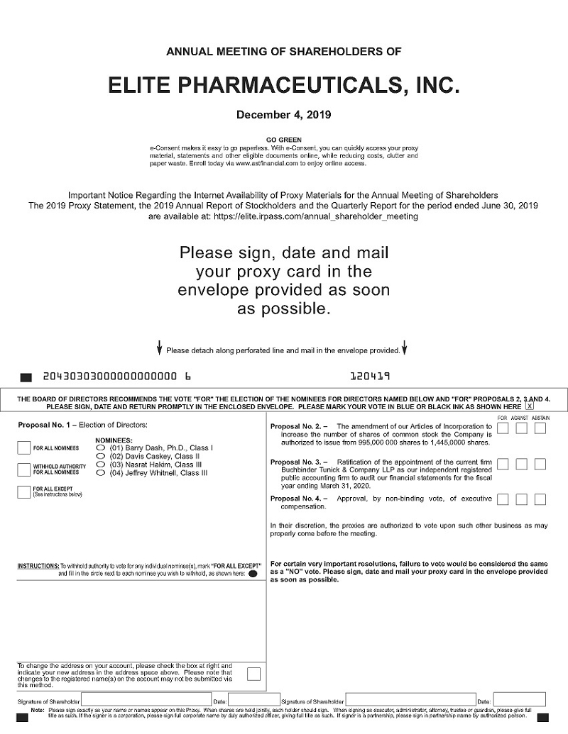 TO THE SHAREHOLDERS OF ELITE PHARMACEUTICALS, INC.: