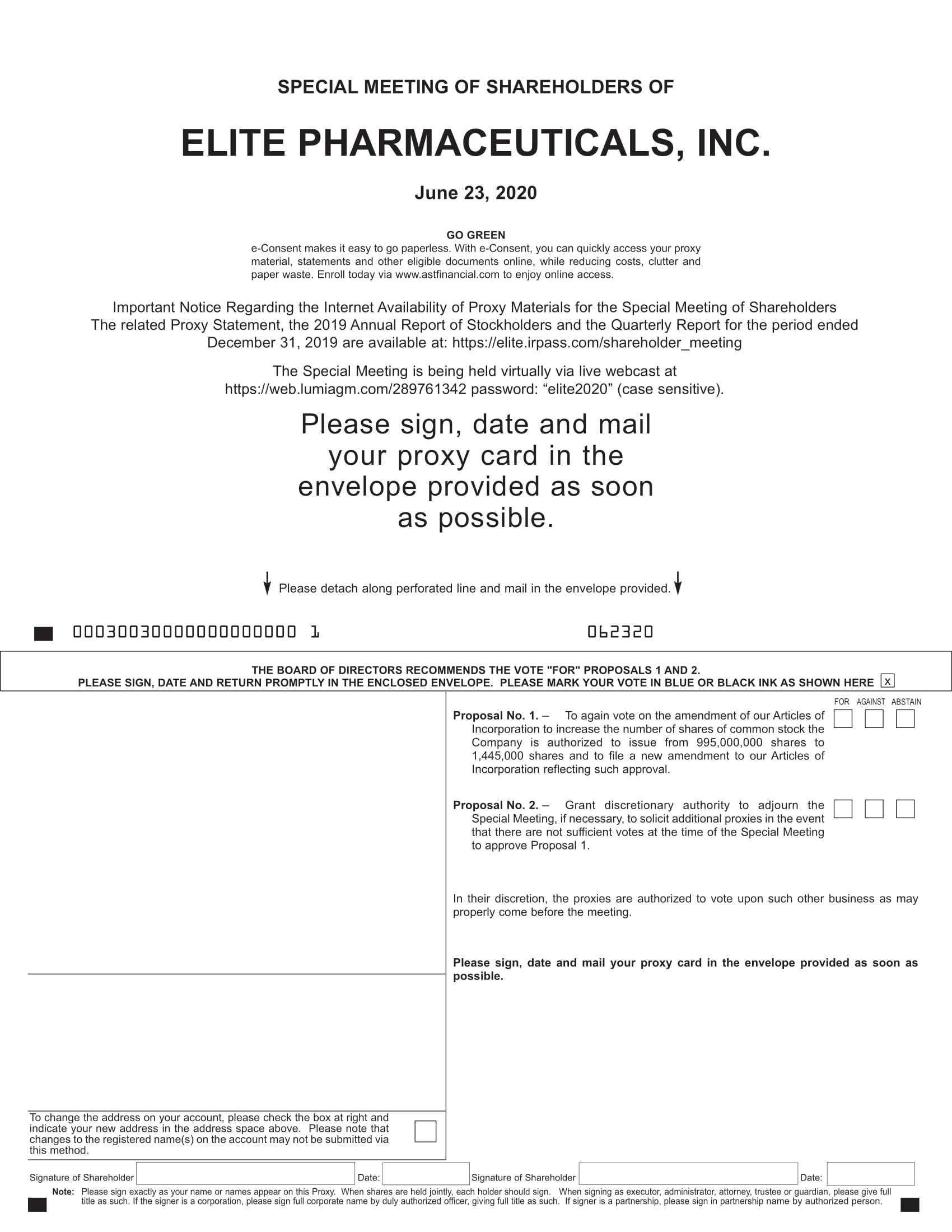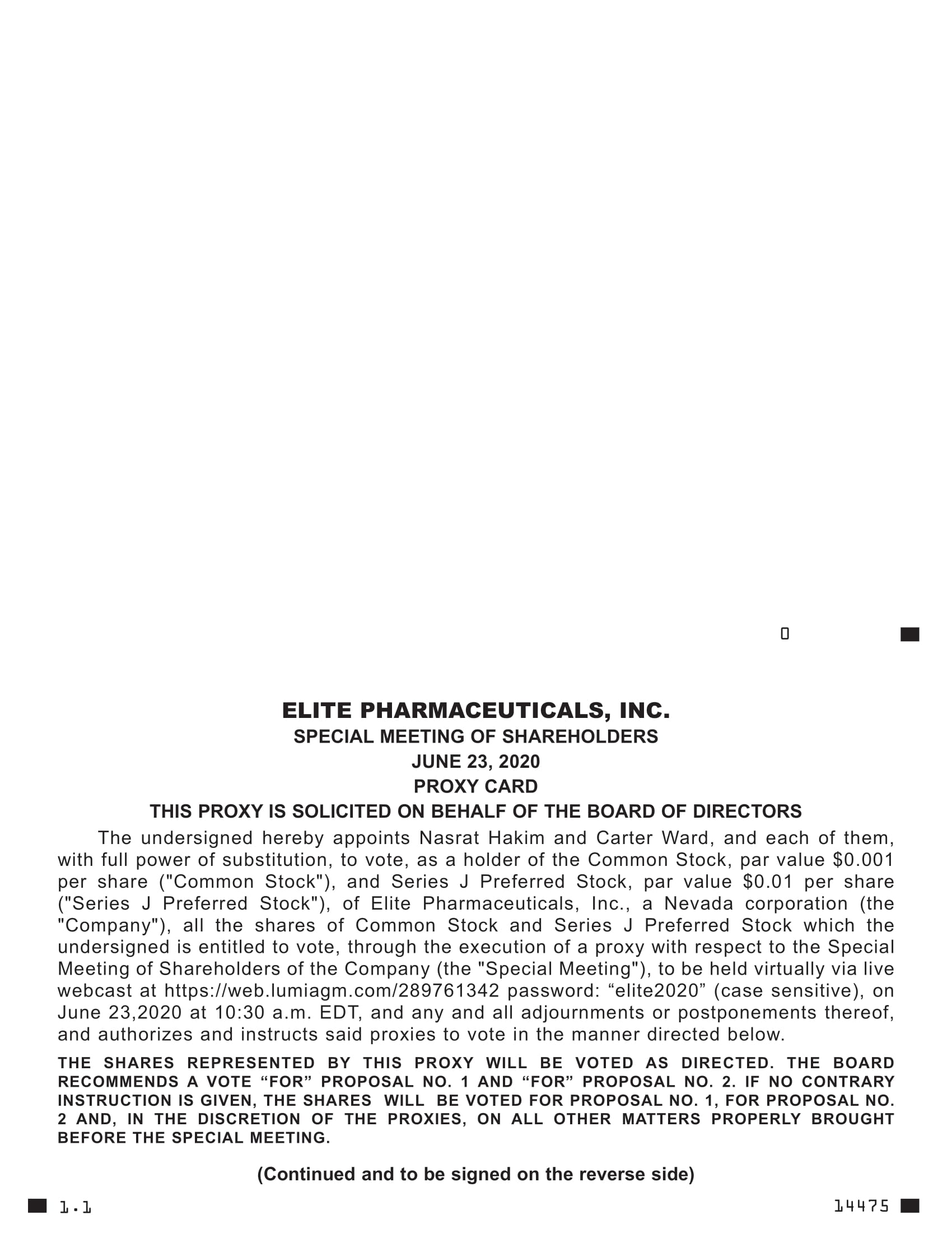 You will receive a confirmation of your registration by email after we receive your registration materials. You may attend the virtual Special Meeting at https://web.lumiagm.com/289761342 password: “elite2020” (case sensitive) and vote your shares during the meeting. Follow the instructions provided to vote. We encourage you to access the meeting prior to the start time leaving ample time for the check in.